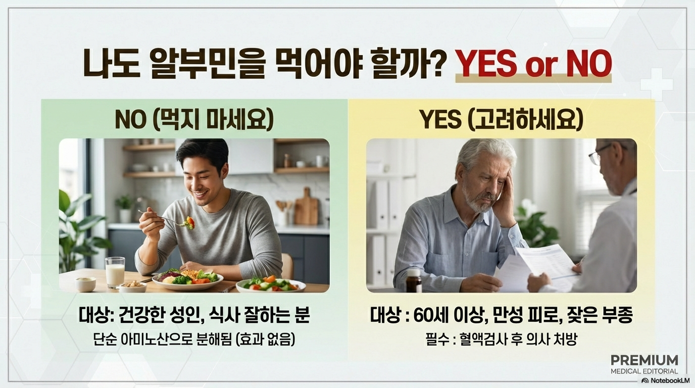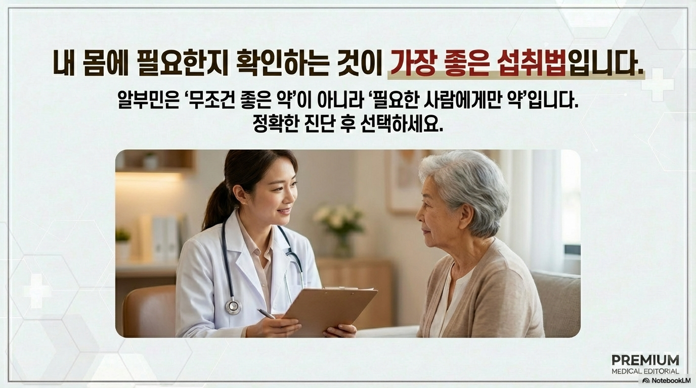 👉알부민은 '먹으면 무조건 좋은 영양제'가 아니라 '필요한 사람에게만 도움이 되는 성분'이에요! 나에게 정말 필요한지 먼저 확인하는 것이 가장 현명한 선택입니다.