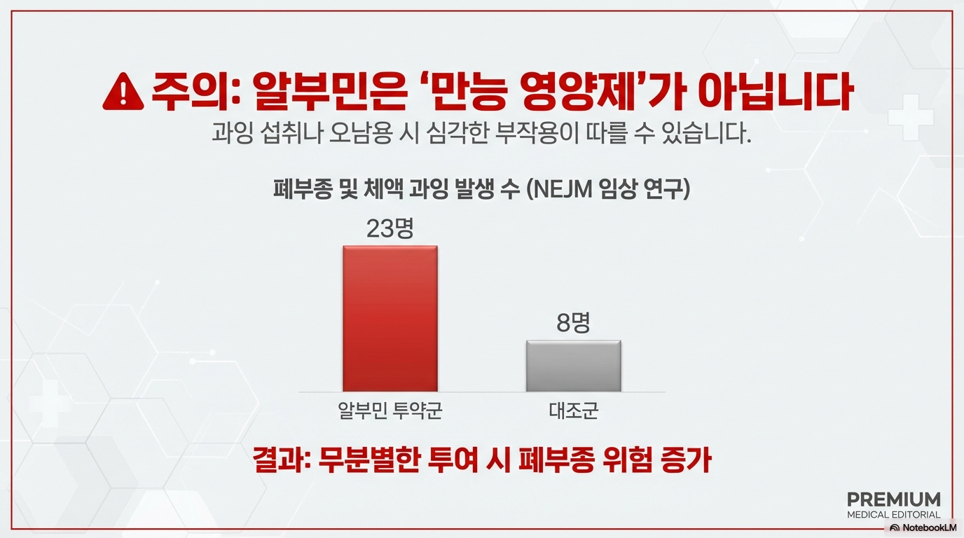 국제학술지 NEJM에 발표된 대규모 임상 연구에서 알부민 투약군이 폐부종과 체액 과잉 부작용이 더 많이 발생했어요. (투약군 23명, 대조군 8명)