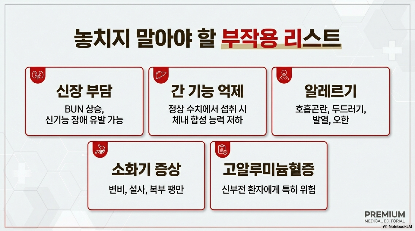 ✅ 폐부종, 체액 과잉, 신장 부담, 알레르기 반응 등의 부작용이 있을 수 있어요.