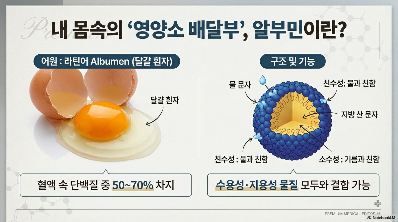 알부민은 단백질, 지방산, 비타민, 미네랄, 호르몬 등을 혈액을 통해 온몸으로 운반해요. 우리 몸 곳곳에 필요한 영양소를 배달하는 택배 기사 같은 역할이죠.