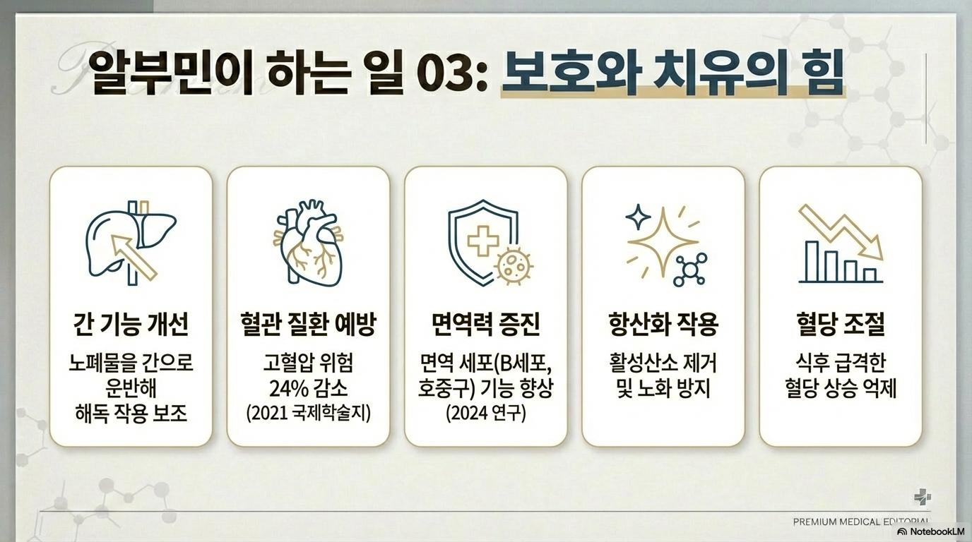 ✅ 알부민은 간에서 만들어지는 단백질로 영양소 운반, 삼투압 조절, 간 기능 개선에 도움을 줘요.