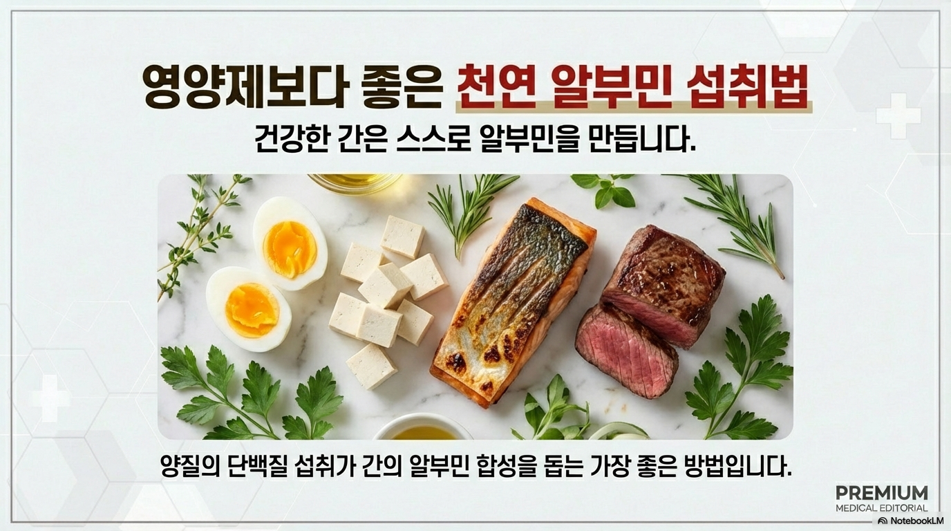 건강한 성인은 두부, 달걀, 고기, 생선 같은 단백질 음식을 충분히 먹으면 간에서 알부민을 스스로 만들어요. 시중의 알부민 영양제는 대부분 일반식품으로 분류되며, 섭취 시 아미노산으로 분해되어 흡수되기 때문에 비싼 단백질 음료를 먹는 것과 크게 다르지 않습니다.