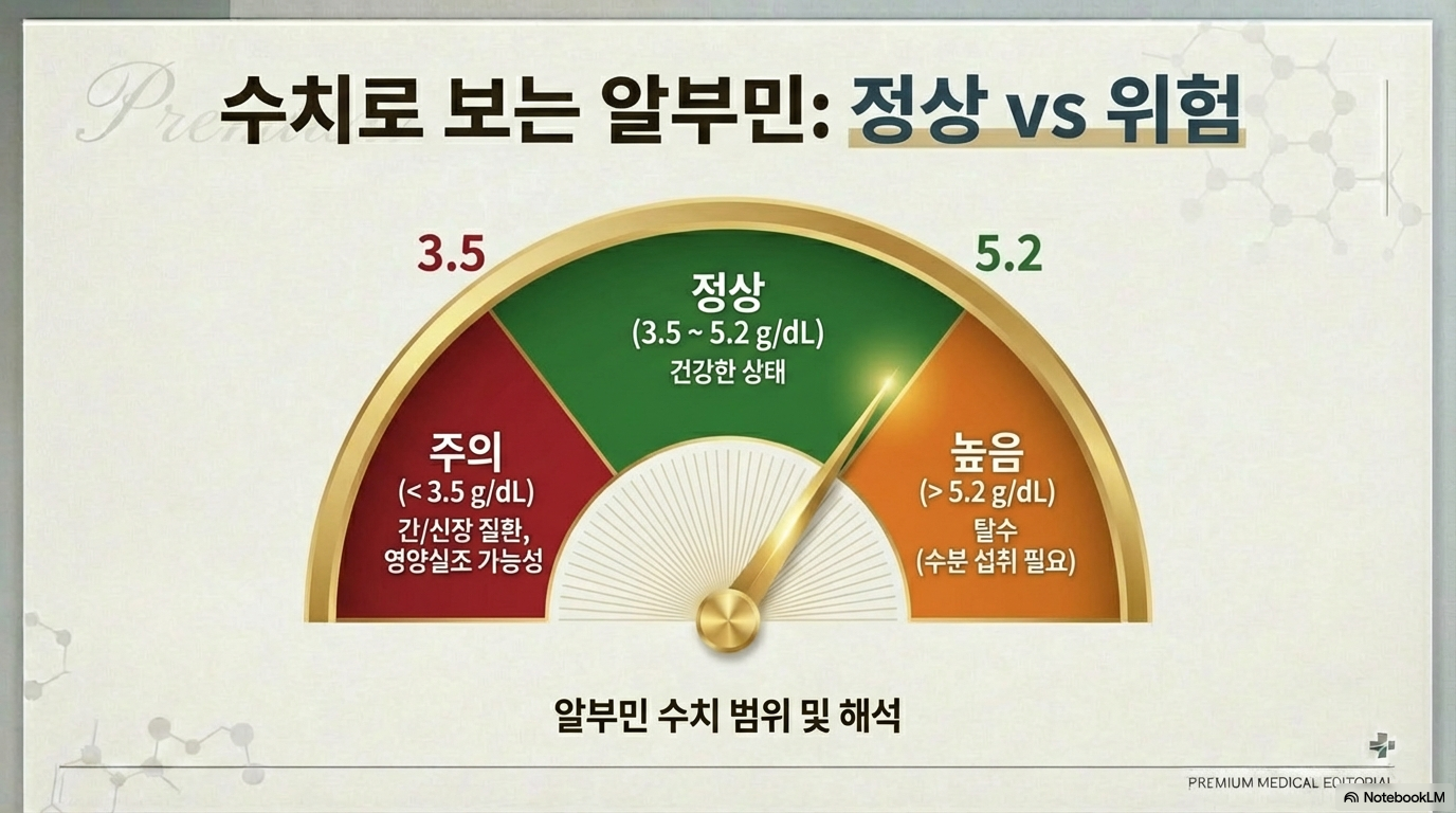 3.5 g/dL 이하 간염, 간경화, 신장 질환, 영양실조 가능성이 있어요.