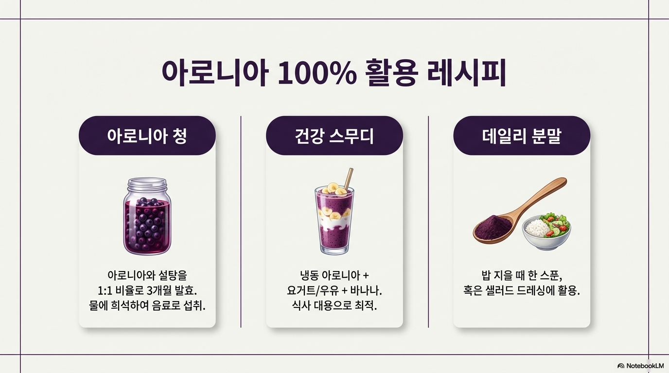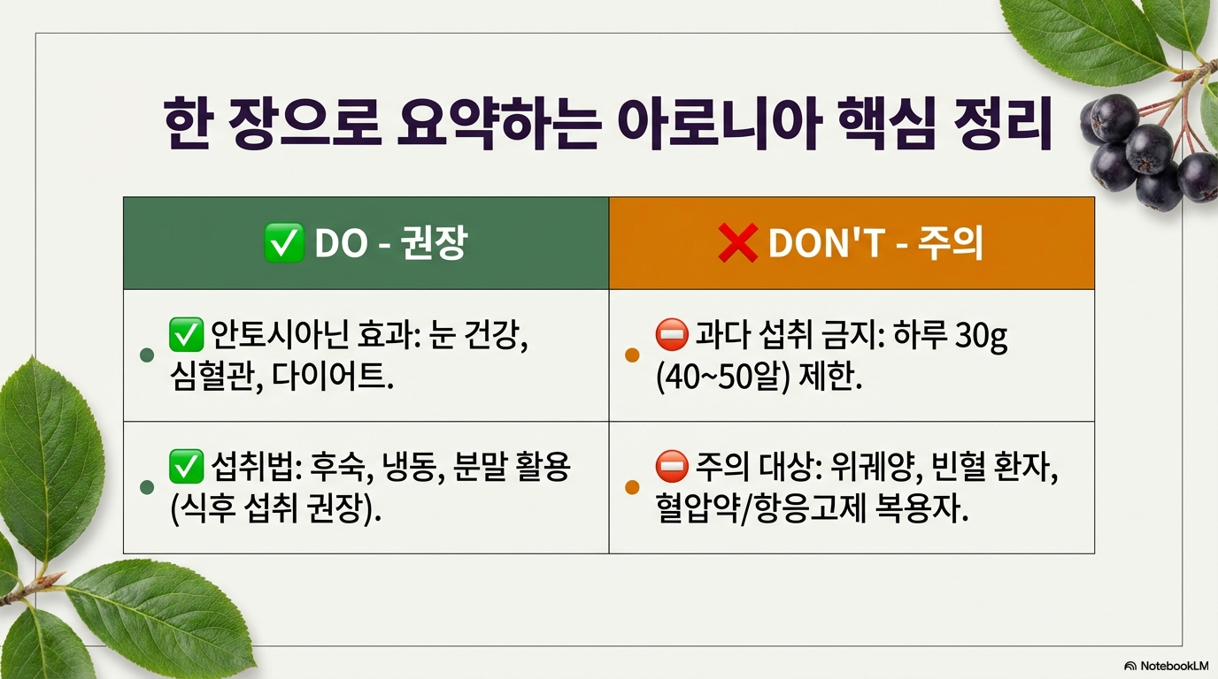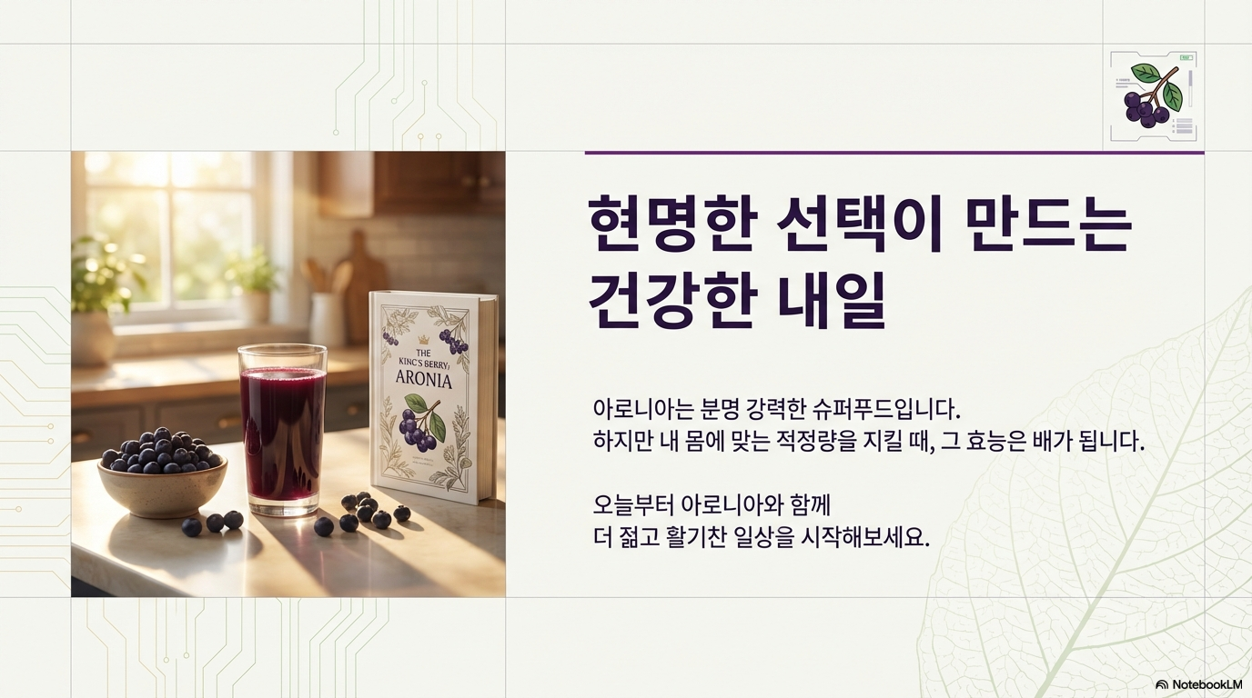 아로니아는 분명 건강에 좋은 슈퍼푸드예요. 하지만 아무리 좋은 음식도 내 몸 상태에 맞게, 적정량을 지켜서 먹어야 진짜 효과를 볼 수 있답니다. 특히 만성질환이 있거나 약물을 복용 중이라면 반드시 전문가와 상담 후 드세요.