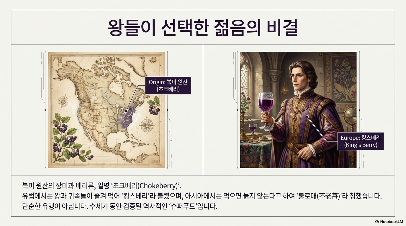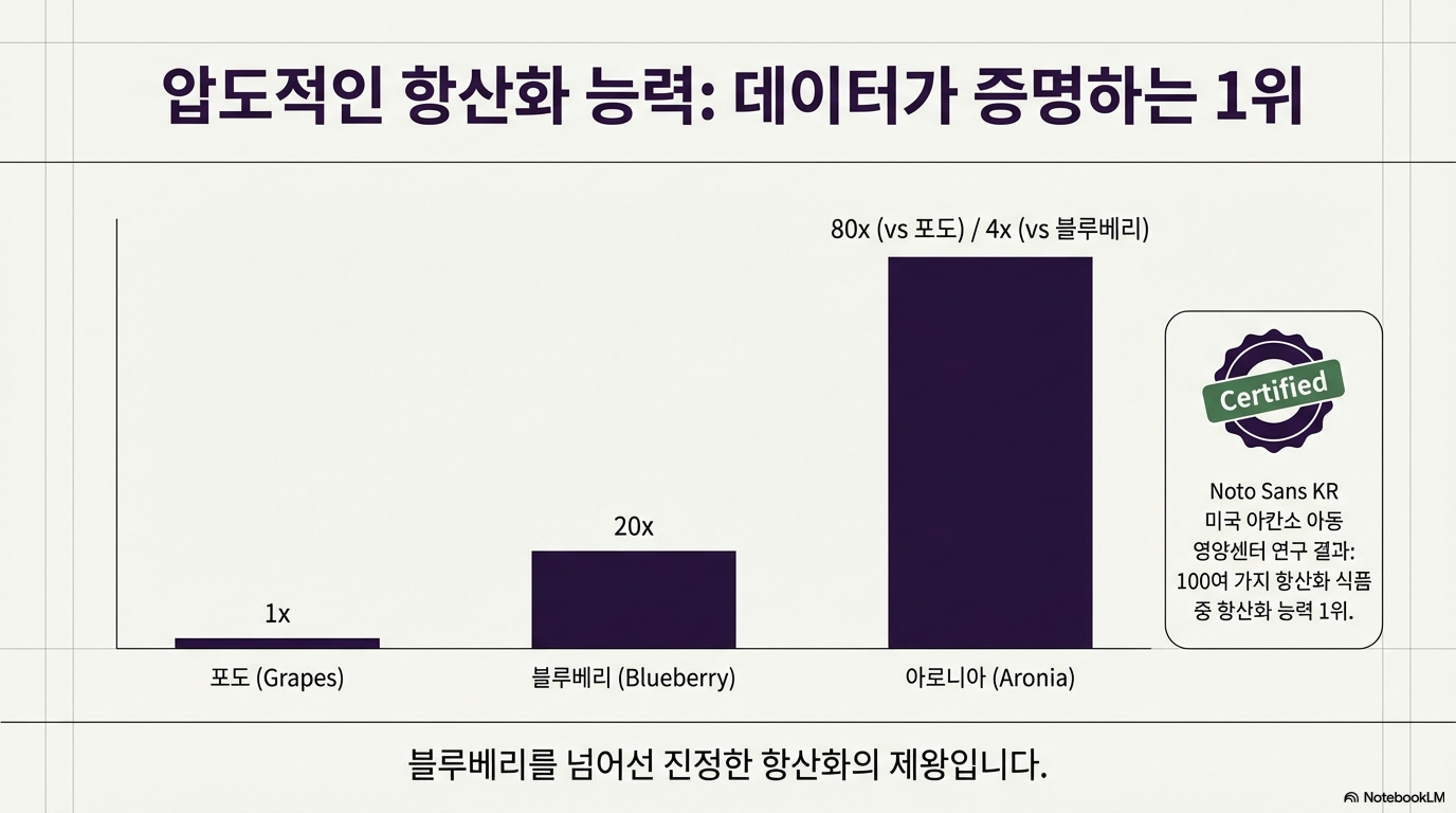 아로니아는 북미 원산의 장미과 베리류 과일이에요. 블루베리와 비슷하게 생겼지만 안토시아닌 함량은 블루베리의 4배, 포도의 80배에 달한다고 하니 정말 놀랍죠. 미국 아칸소 아동 영양센터 연구에 따르면 100여 가지 항산화 식품 중 아로니아의 항산화 능력이 가장 강력하다는 결과가 나왔어요. 유럽에서는 왕과 귀족들이 즐겨 먹었다고 해서 '킹스베리'라 불렸고, 동양에서는 먹으면 늙지 않는다 하여 '불로매'라고 불렸답니다.
