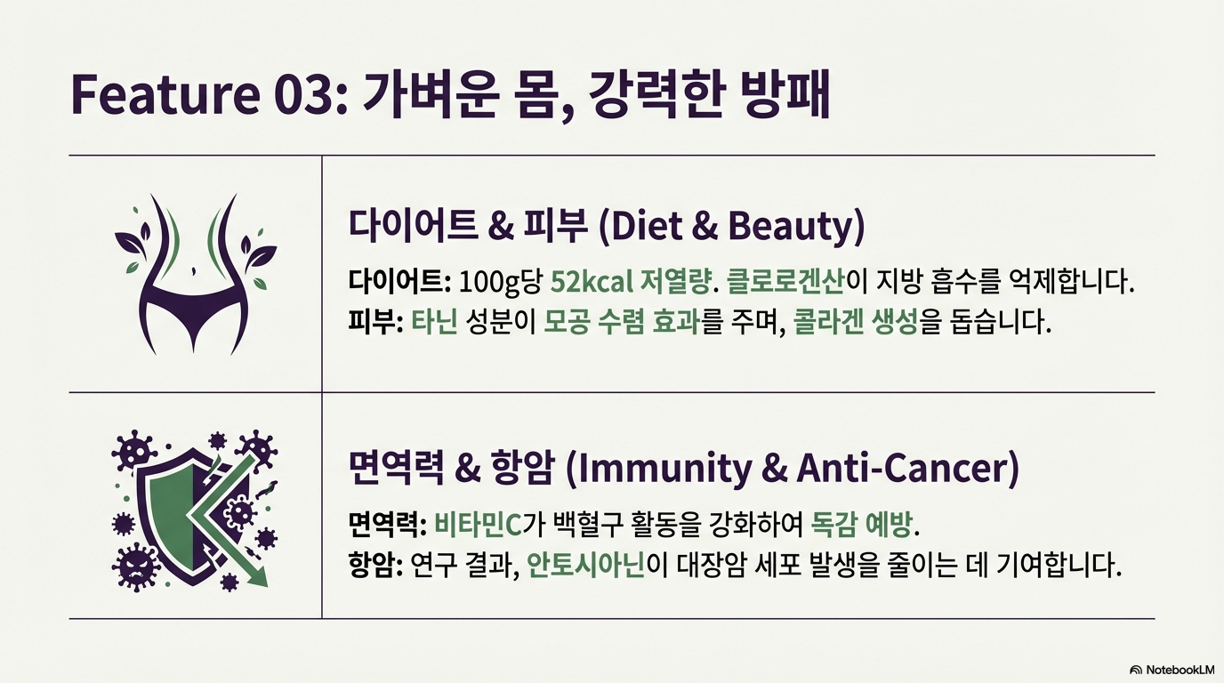 100g당 52kcal의 저열량 과일이면서도 식이섬유가 풍부해 포만감을 쉽게 느낄 수 있어요. 카로티노이드 성분이 지방 대사를 촉진하고, 클로로겐산이 장내 지방 흡수를 억제해서 체중 감량에 효과적이랍니다.