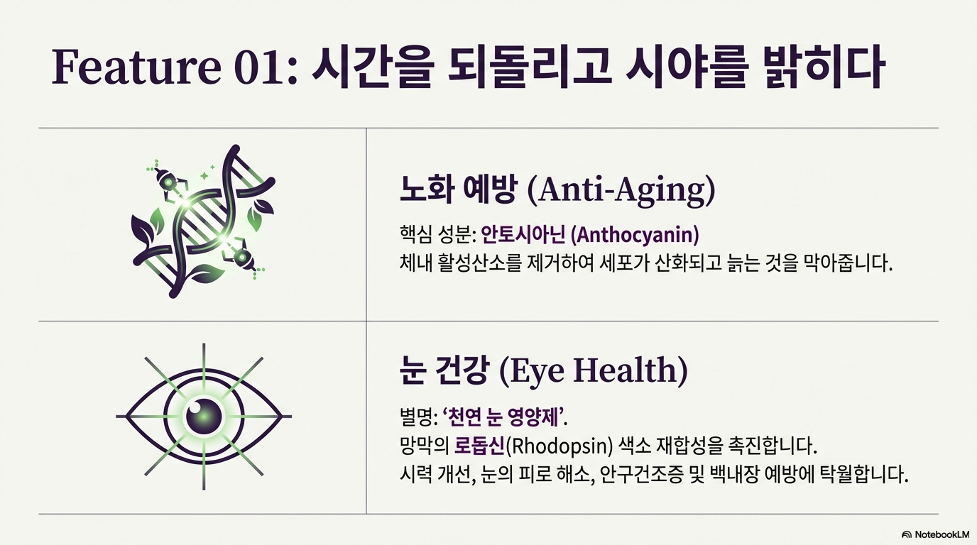 아로니아는 '천연 눈 영양제'라는 별명답게 눈 건강에 탁월해요. 눈의 망막에 있는 로돕신이라는 색소의 재합성을 촉진해서 시력 개선과 눈의 피로 해소에 도움을 줘요. 특히 안구건조증, 백내장, 황반변성 같은 안과 질환 예방에도 효과적이랍니다.