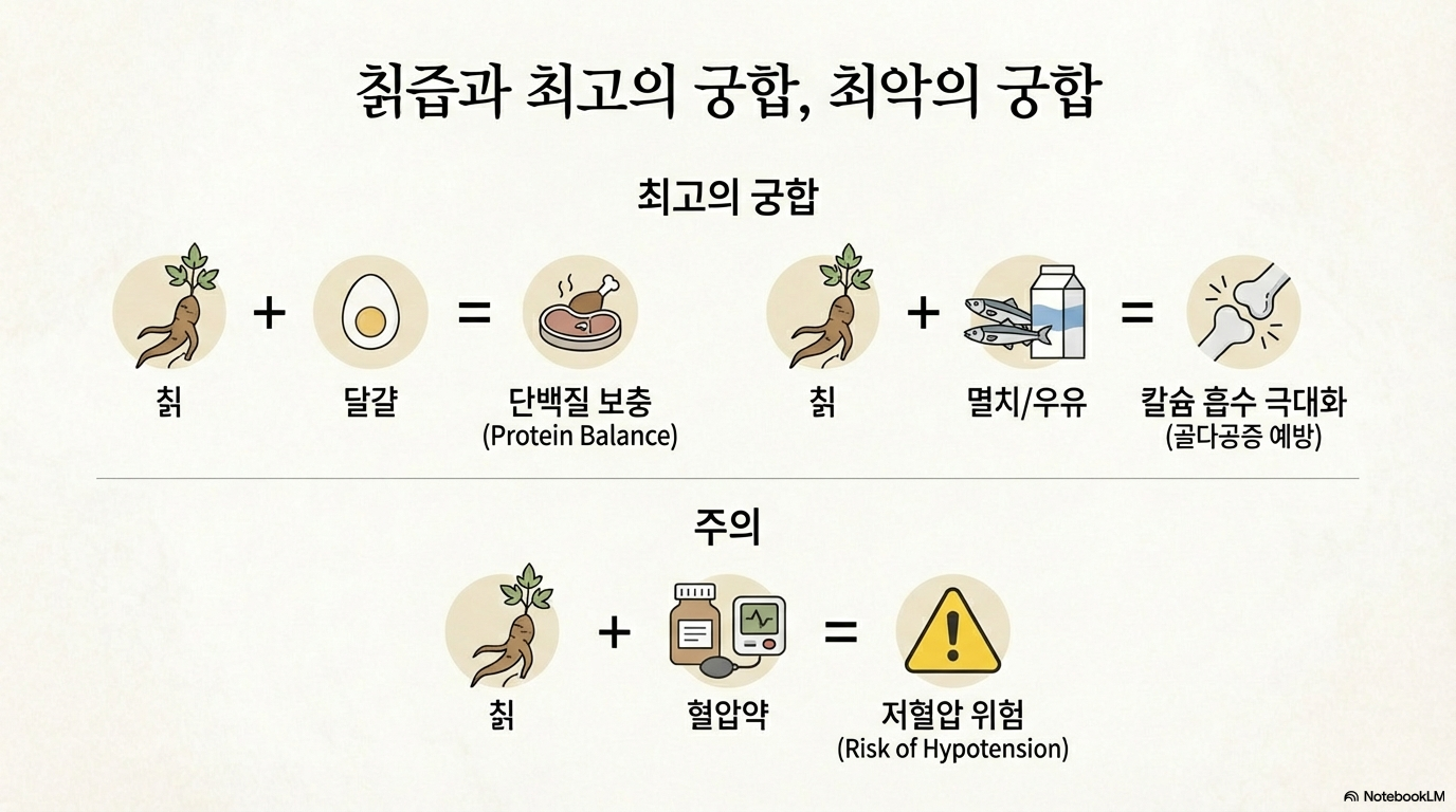 칡은 달걀과 함께 먹으면 칡에 부족한 단백질과 무기질을 보충할 수 있어 궁합이 아주 좋아요. 골다공증 예방을 위해서는 멸치, 우유, 연어 등 칼슘 함유 식품과 함께 섭취하세요.