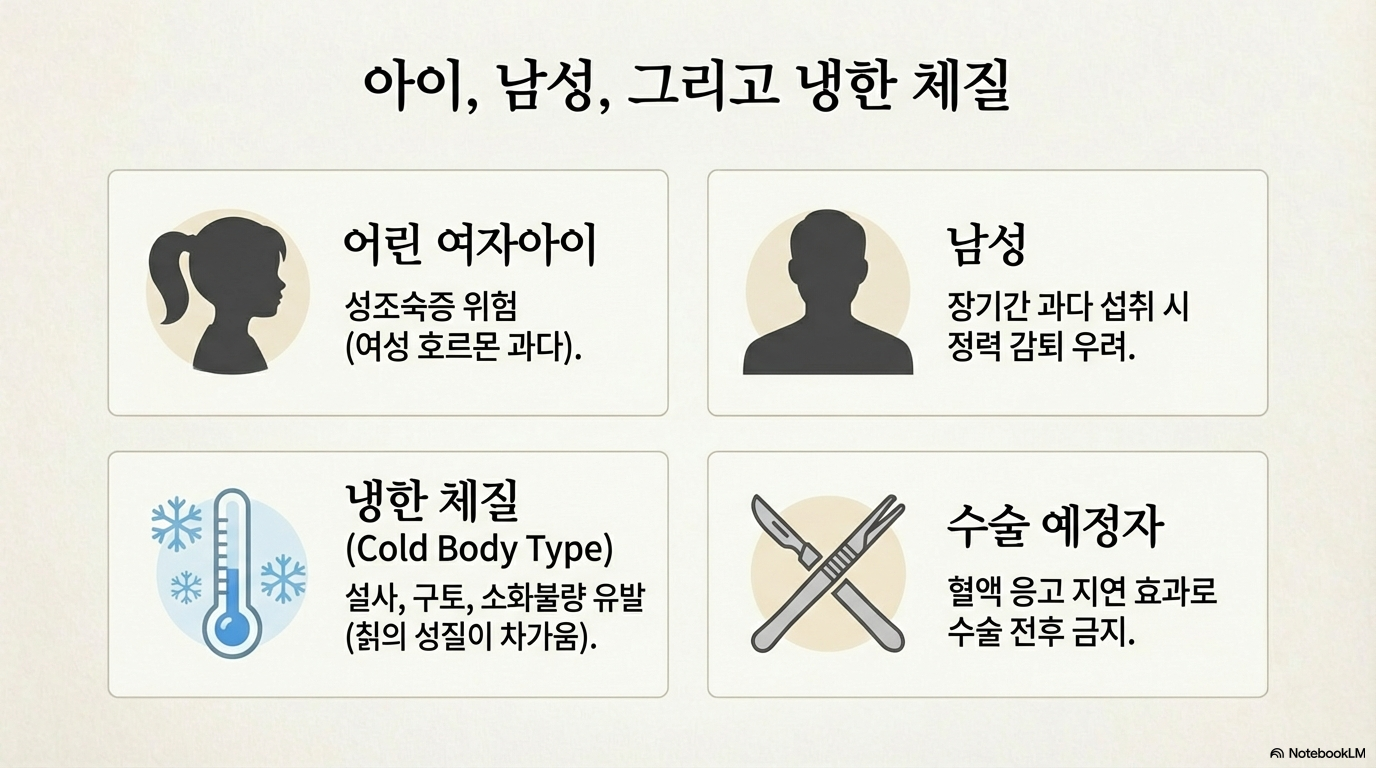 임신 중이거나 모유 수유 중인 여성의 경우, 칡의 이소플라본 성분이 호르몬 변화에 영향을 미칠 수 있어요. 태아나 영유아에게 미치는 영향이 충분히 연구되지 않았으므로 섭취를 피하는 것이 안전합니다.