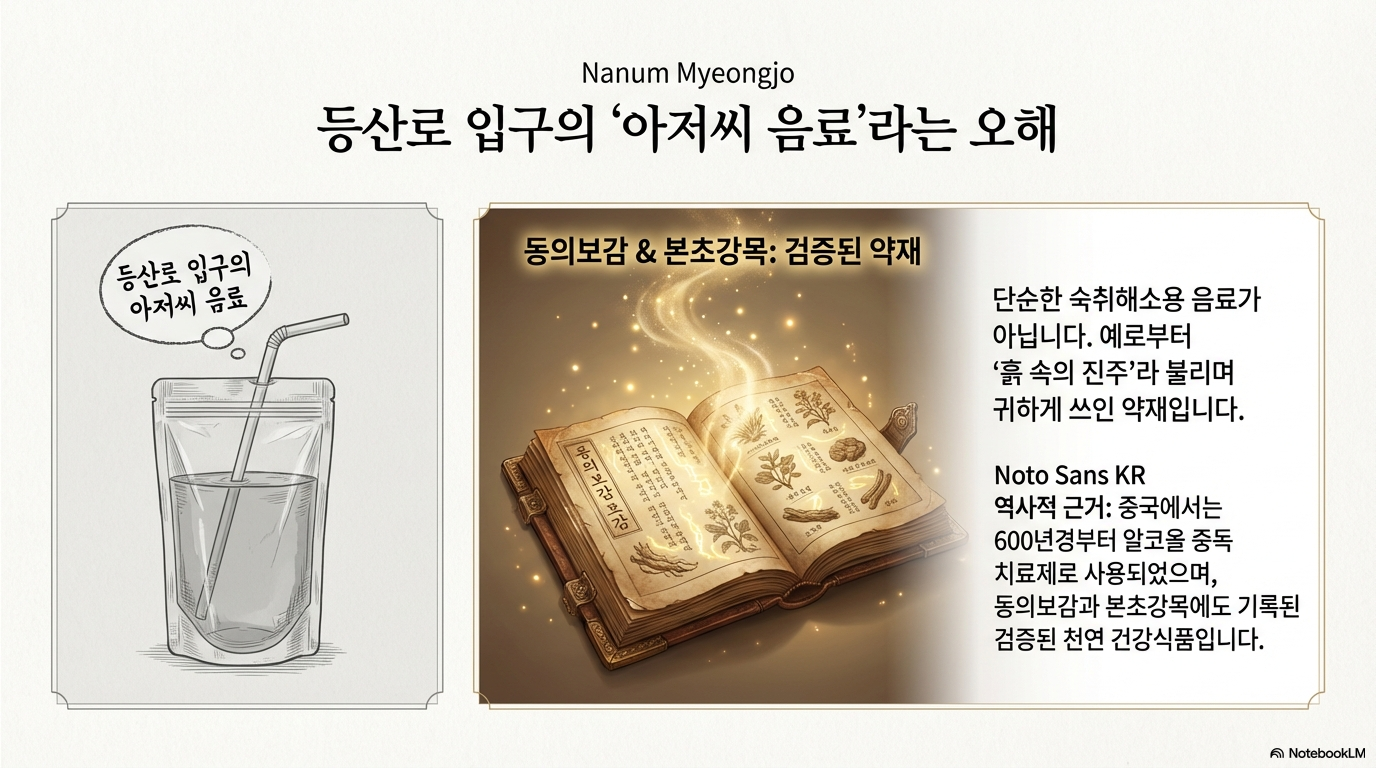 ✔️전통 의학의 관점: 동의보감에는 "칡이 술독을 제거하여 숙취해소에 효과적"이라고 기록되어 있어요. 본초강목의 식료본초 편에는 칡의 유일한 효능으로 "쪄서 먹으면 술독을 없앤다"고 명시되어 있죠.