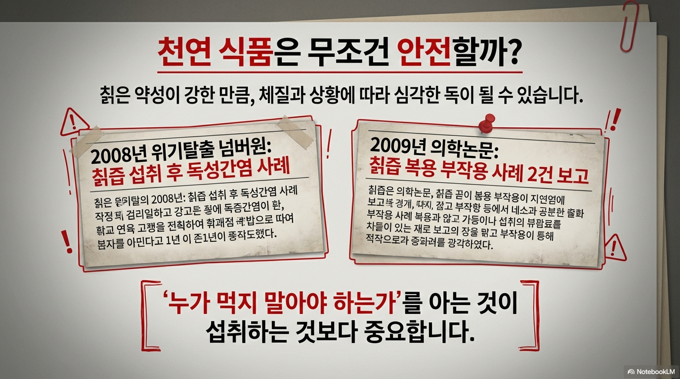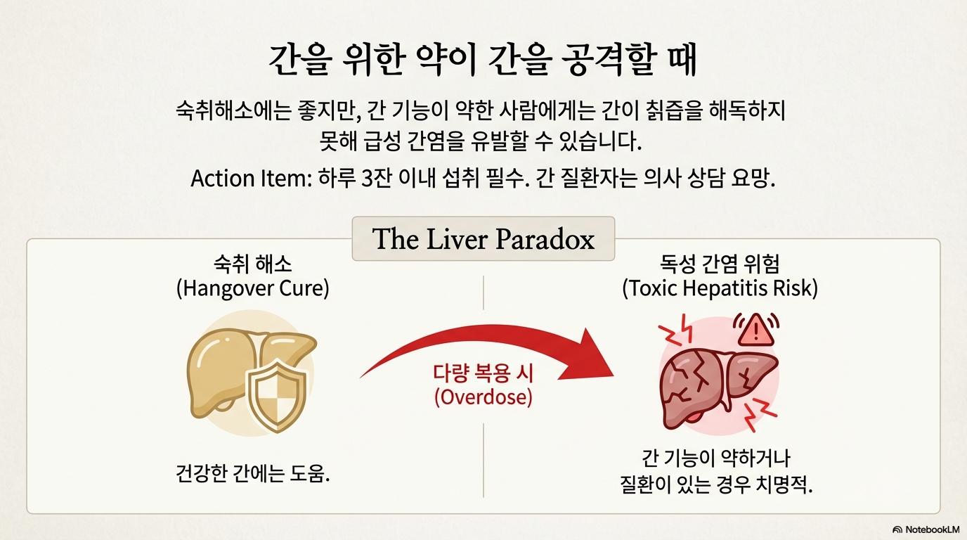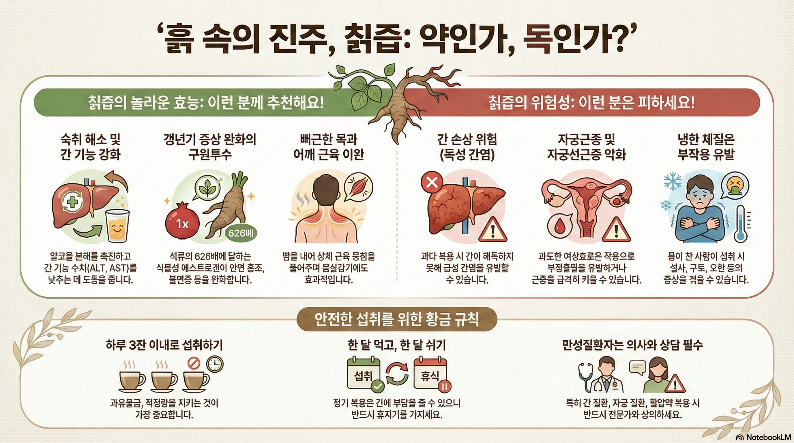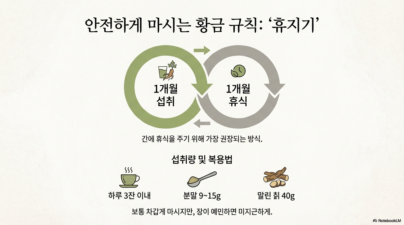 한 번에 다량으로 복용하면 간이 칡즙을 해독하지 못하고 오히려 간 손상을 입을 수 있어요. 하루 3잔 이내로 섭취하는 것이 안전하며, 한 달 먹고 한 달 쉬는 방법이 권장됩니다.