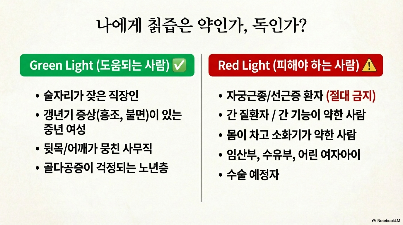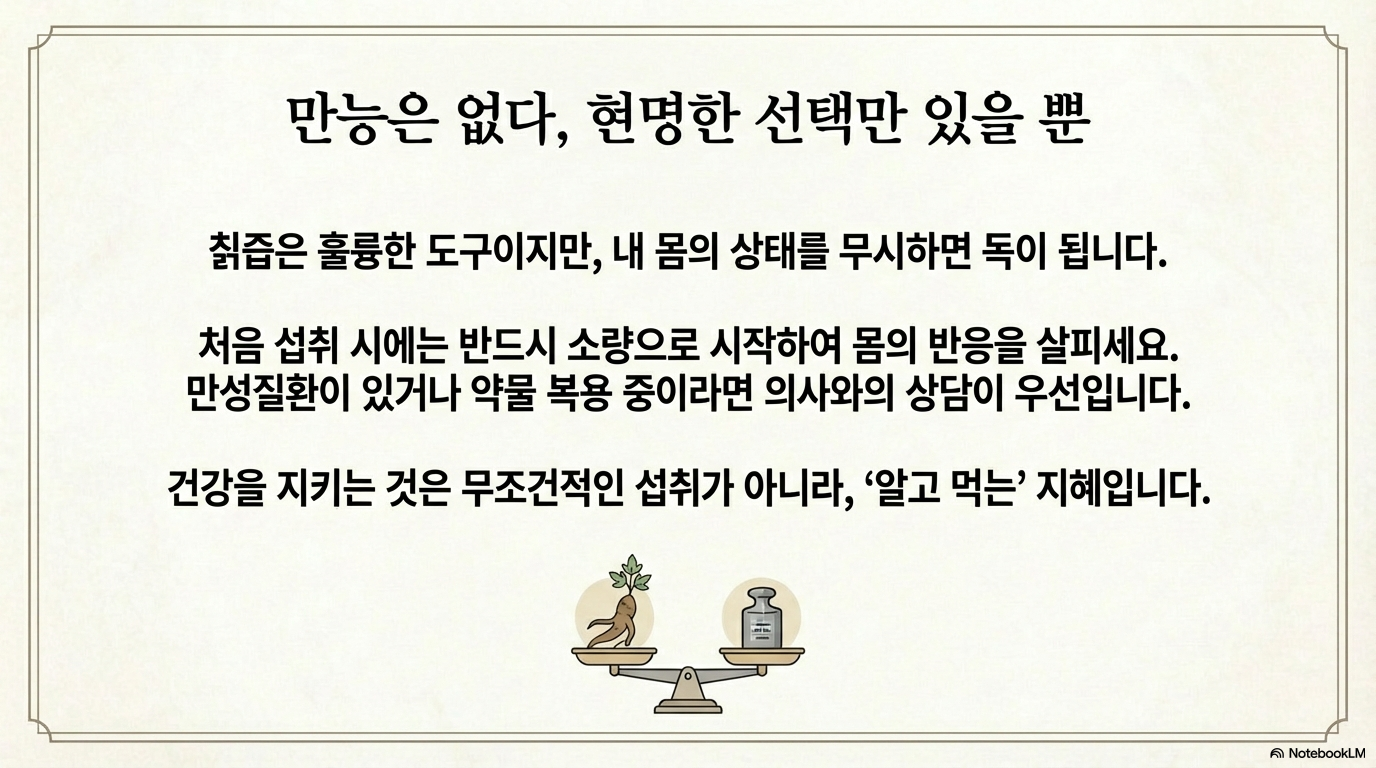 칡즙은 분명 훌륭한 건강식품이지만, 만능이 아니에요. 내 몸의 상태와 체질을 정확히 파악하고, 적정량을 지키는 것이 무엇보다 중요합니다. 특히 자궁근종이 있거나 냉한 체질이라면 섭취를 피하는 것이 안전해요.