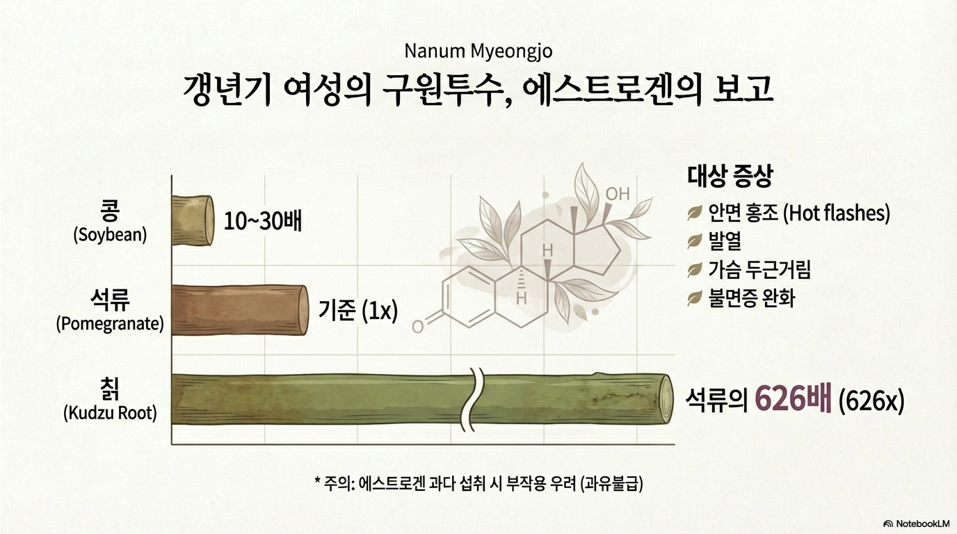 칡에는 식물성 에스트로겐인 이소플라본이 풍부하게 함유되어 있어요. 그 양이 무려 석류의 626배, 콩의 10~30배에 달한다고 합니다! 에스트로겐 분비가 감소하면서 나타나는 안면 홍조, 발열, 가슴 두근거림, 불면증 등의 갱년기 증상을 완화하는 데 탁월한 효과가 있어요. 다만 과유불급이라고, 지나치게 많이 섭취하면 오히려 부작용이 생길 수 있으니 주의가 필요합니다.