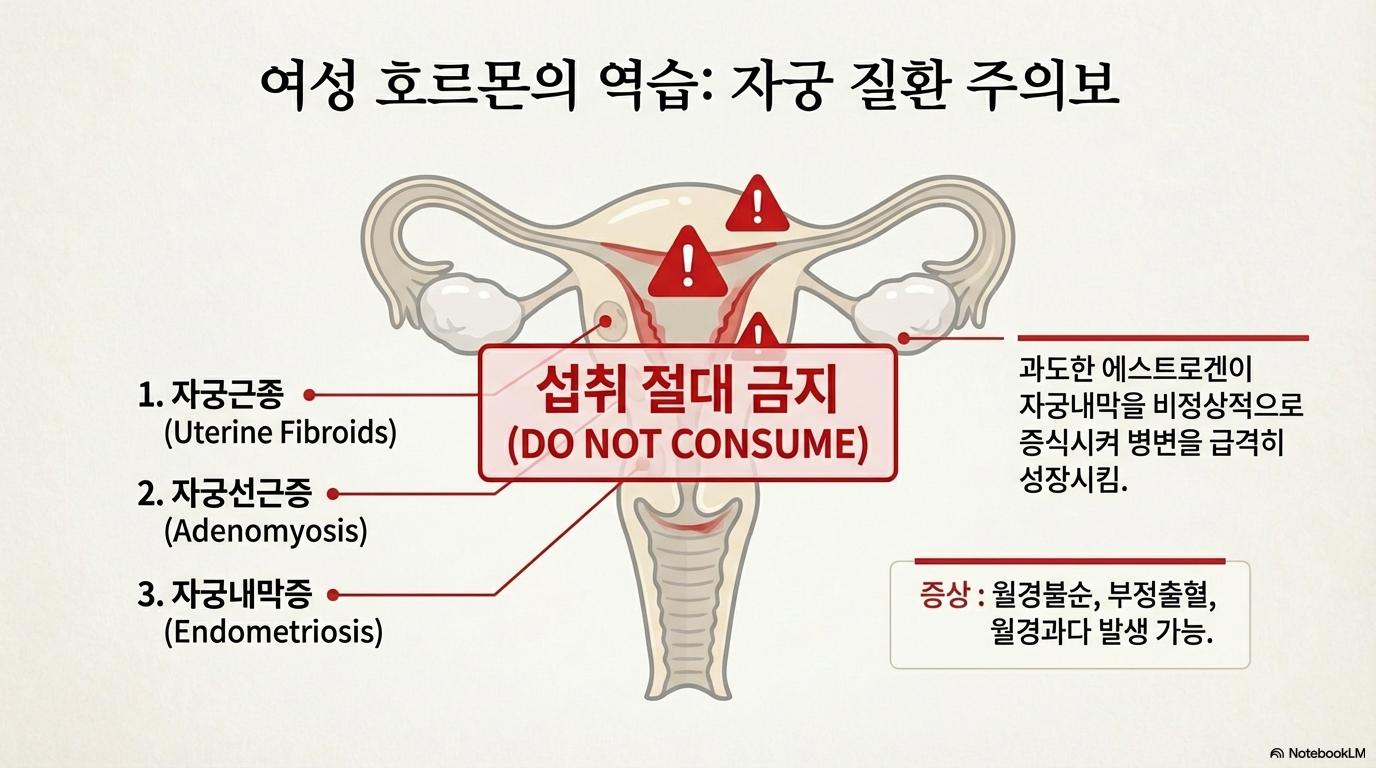 이소플라본의 에스트로겐 유사 작용이 문제가 될 수 있어요. 지나치게 많은 에스트로겐이 지속적으로 공급되면 자궁내막이 비정상적으로 증식하면서 월경불순, 부정출혈, 월경과다를 유발할 수 있습니다.