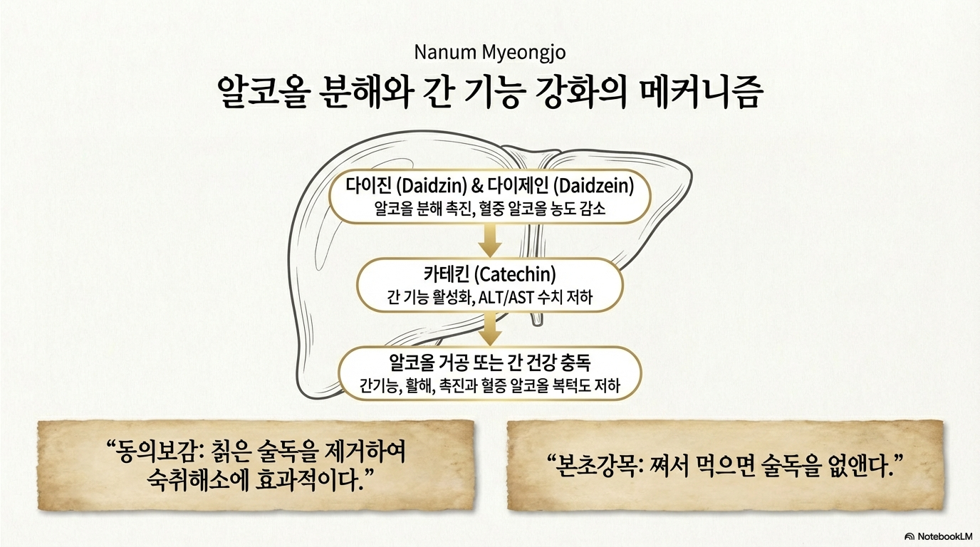 ✔️현대 과학의 관점: 칡에 함유된 다이진(Daidzin)과 다이제인(Daidzein) 성분이 알코올 분해를 촉진하고 혈중 알코올 농도를 낮춰줍니다. 또한 카테킨 성분이 간 기능을 원활하게 만들어 ALT, AST 수치를 낮추는 효과가 있어요.