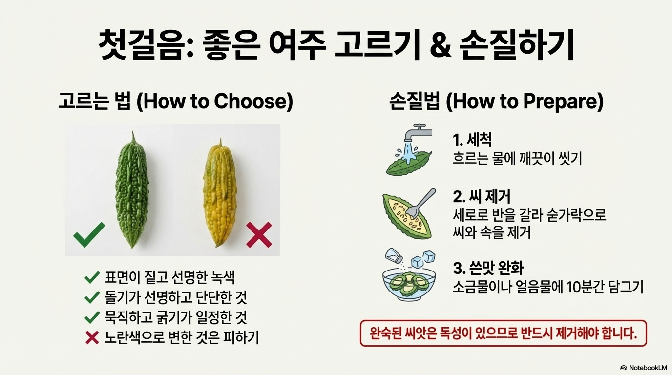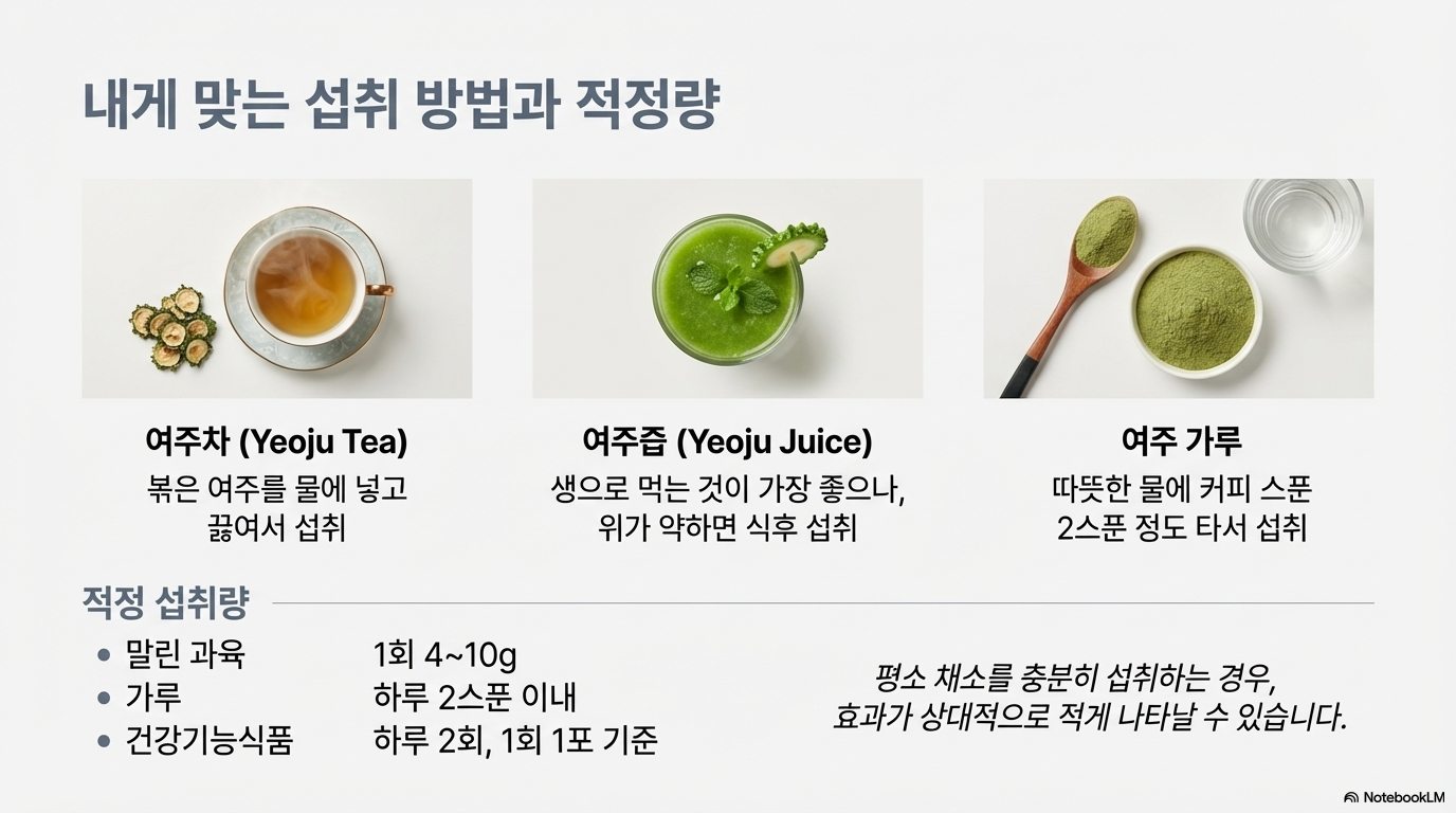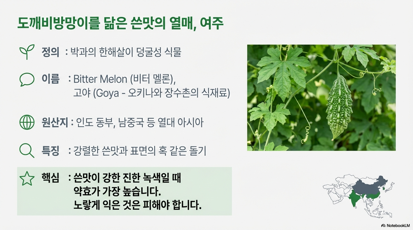 중요: 쓴맛이 강한 진한 녹색일 때 최대 효과를 볼 수 있으며, 노랗게 익은 여주는 빨리 상하고 약효도 약해지므로 녹색 열매를 먹는 것이 좋아요.