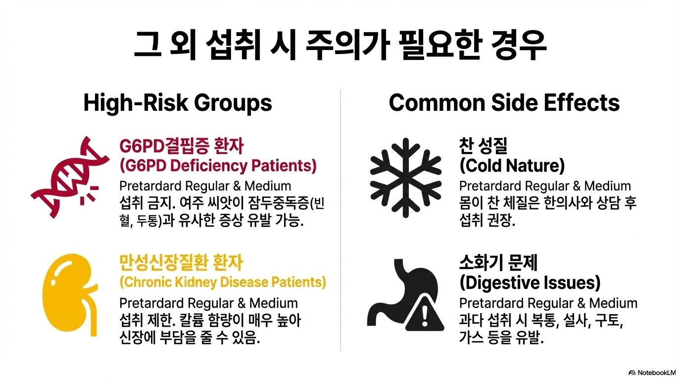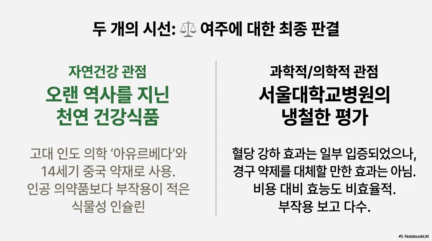 과학적 관점: 서울대학교병원의 명확한 경고가 있어요. "혈당 강하 효과는 일부 입증되었으나, 같은 기능을 하는 경구당뇨약제와 비교 실험한 논문에서도 경구 약제를 대체할 만한 효과를 보이지 않았으며, 비용 대비 효능면에서도 비효율적이었습니다. 부작용 관련 보고가 많았고, 특히 분말이나 즙 형태로 섭취 시 더 큰 부작용이 발생하는 사례도 있었습니다."