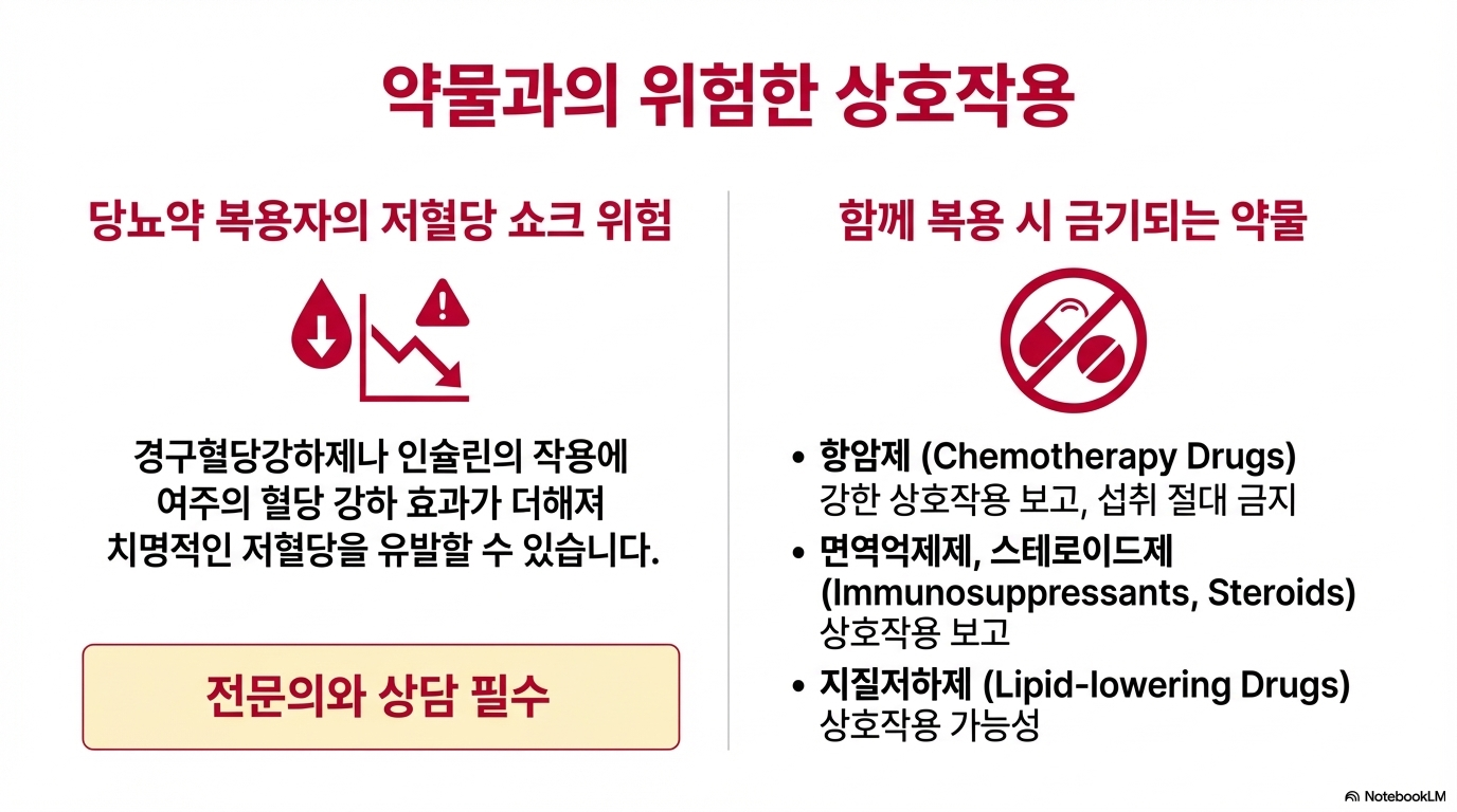 - 약물 상호작용 주의 - 항암제, 면역억제제 복용자는 섭취 금지!