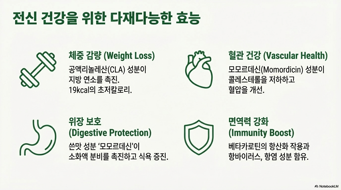 오브투신(Obtusin) 성분은 혈압을 안정적으로 유지하는 작용이 있어 뇌졸중 같은 심혈관 질환 예방에 도움이 돼요. 사포닌계 알칼로이드 성분인 모모르데신은 콜레스테롤을 저하하는 작용을 하여 혈압을 개선하죠. 칼륨, 마그네슘, 칼슘, 엽산 등 혈압 안정을 돕는 성분들이 풍부해요. 동맥경화 예방, 자궁수축작용, 피부진균 억제 효과도 있답니다.