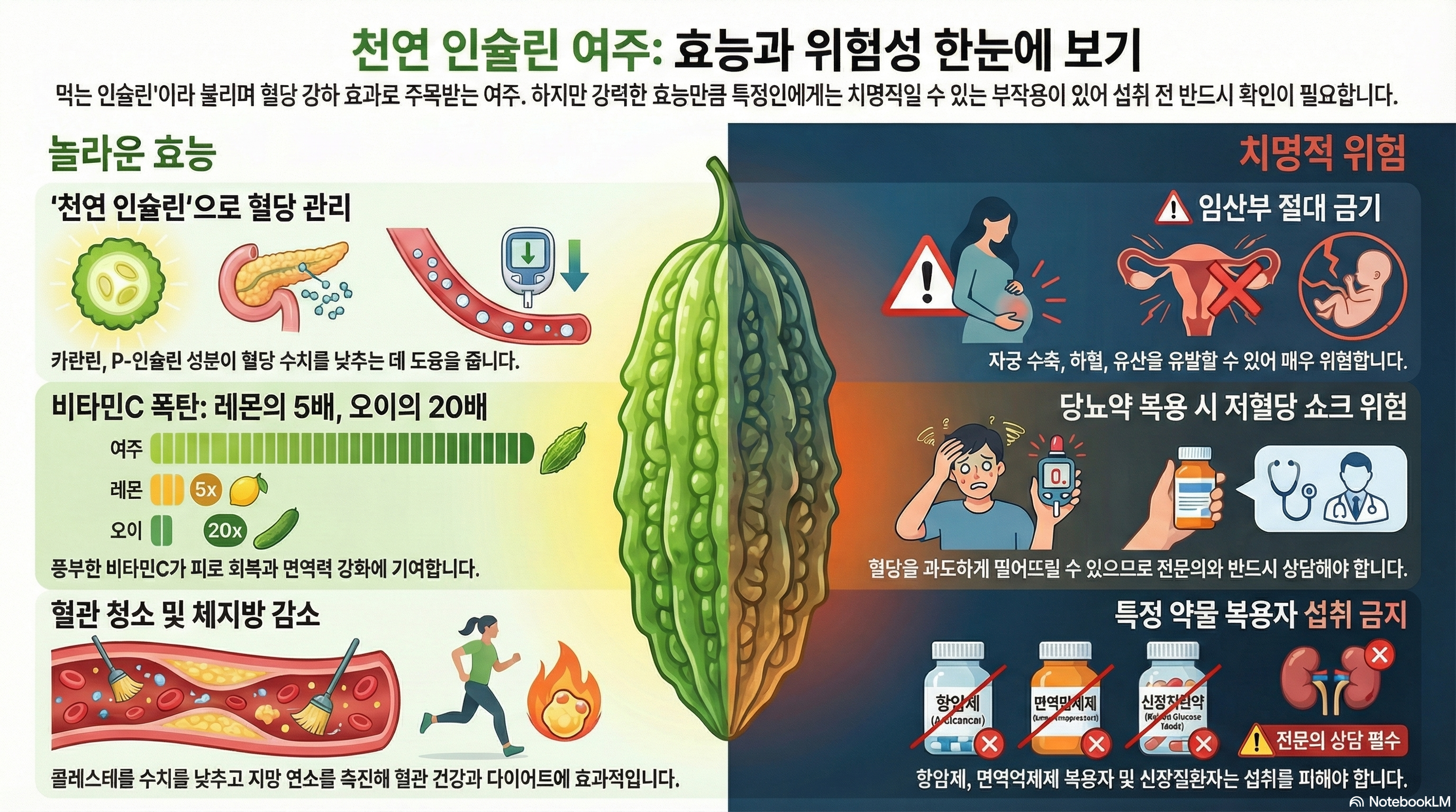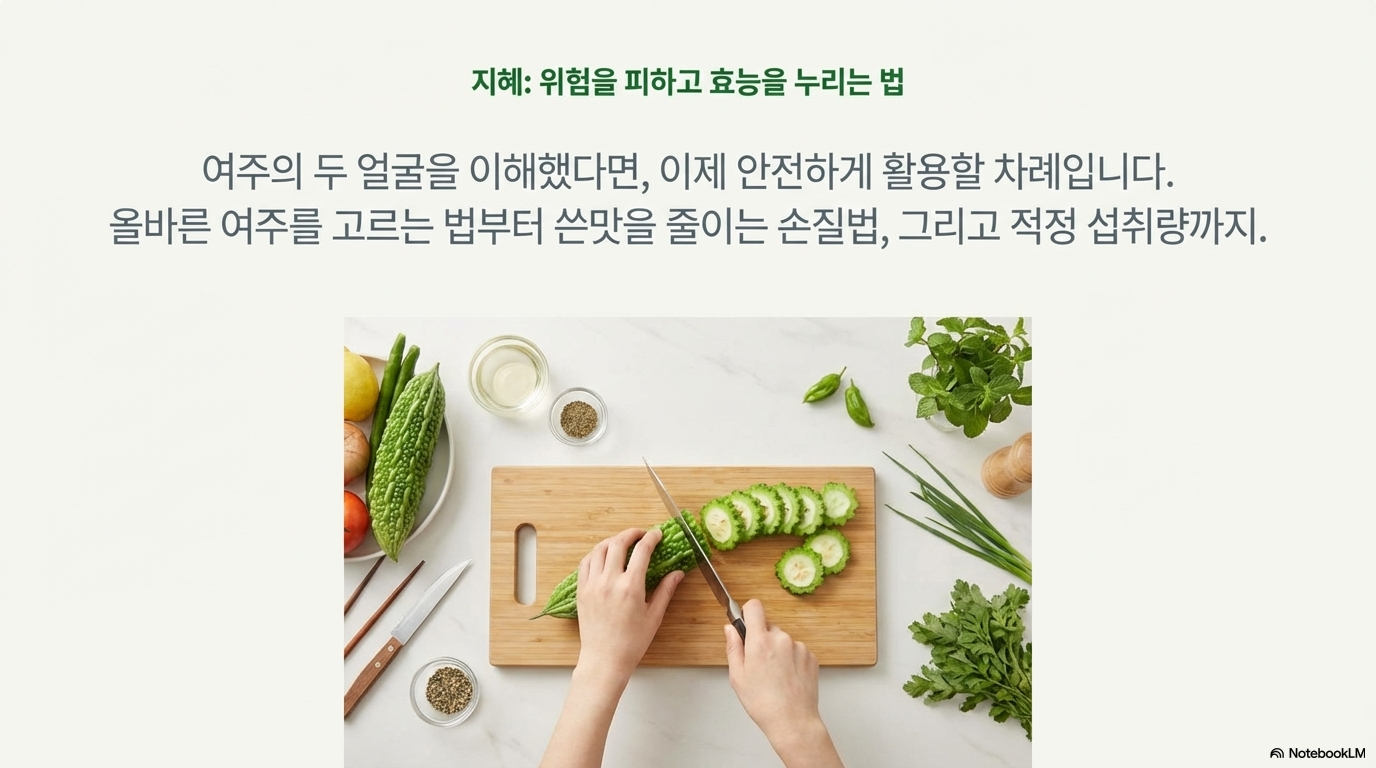 여주는 식품이지 약품이 아니에요. 건강한 사람이 적정량을 지켜 올바르게 섭취할 때 당뇨 예방과 혈관 건강에 도움을 얻을 수 있는 건강 식재료예요. 하지만 임산부, 약물 복용자, 신장질환자는 반드시 주의하세요!