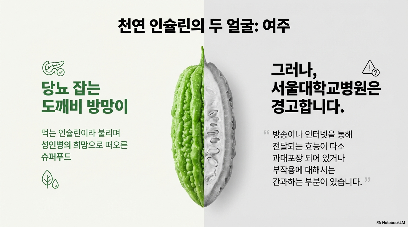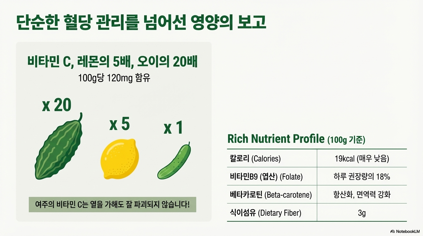 여주는 "천연 인슐린", "먹는 인슐린"이라 불릴 만큼 혈당 강하 효과가 뛰어난 것은 사실이에요. 비타민C가 레몬의 5배, 혈당 부하 지수 1로 당뇨 환자들에게 좋은 식품이죠.