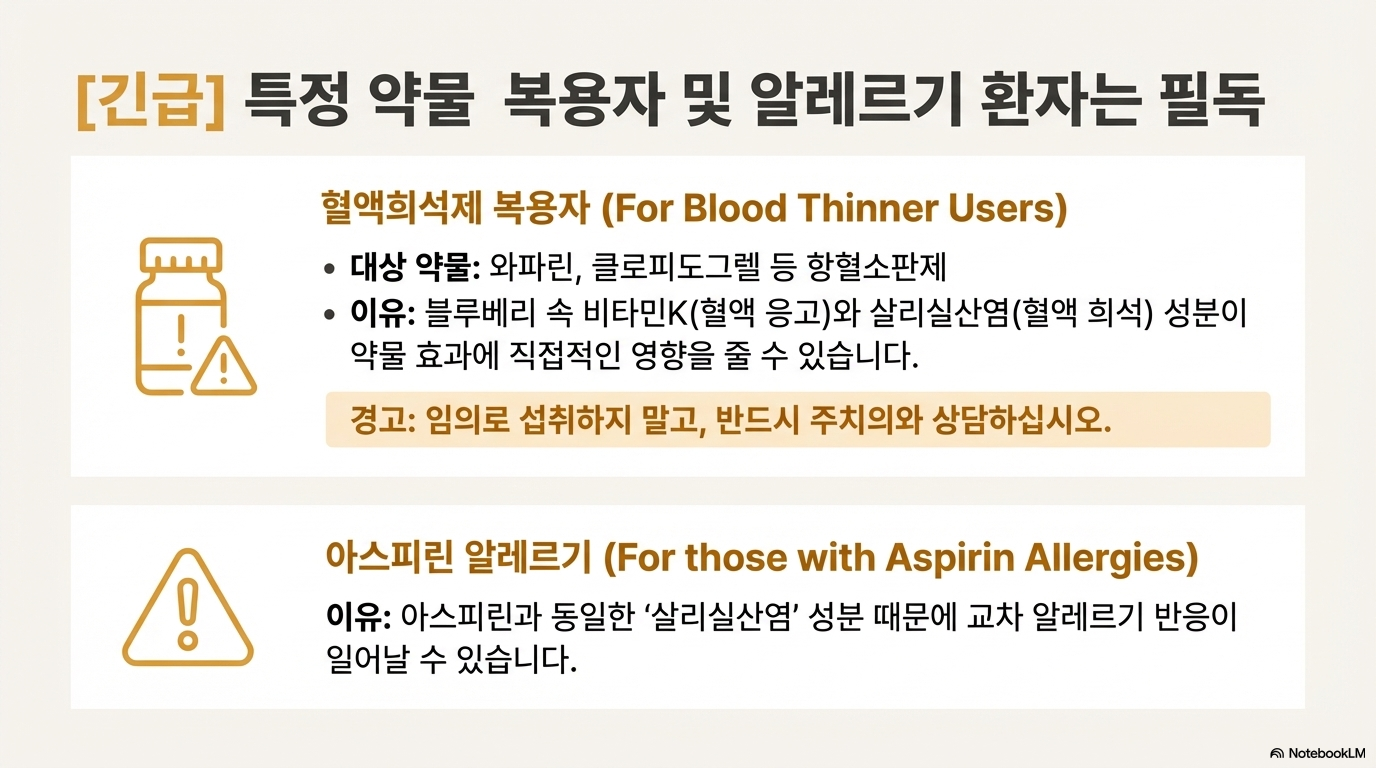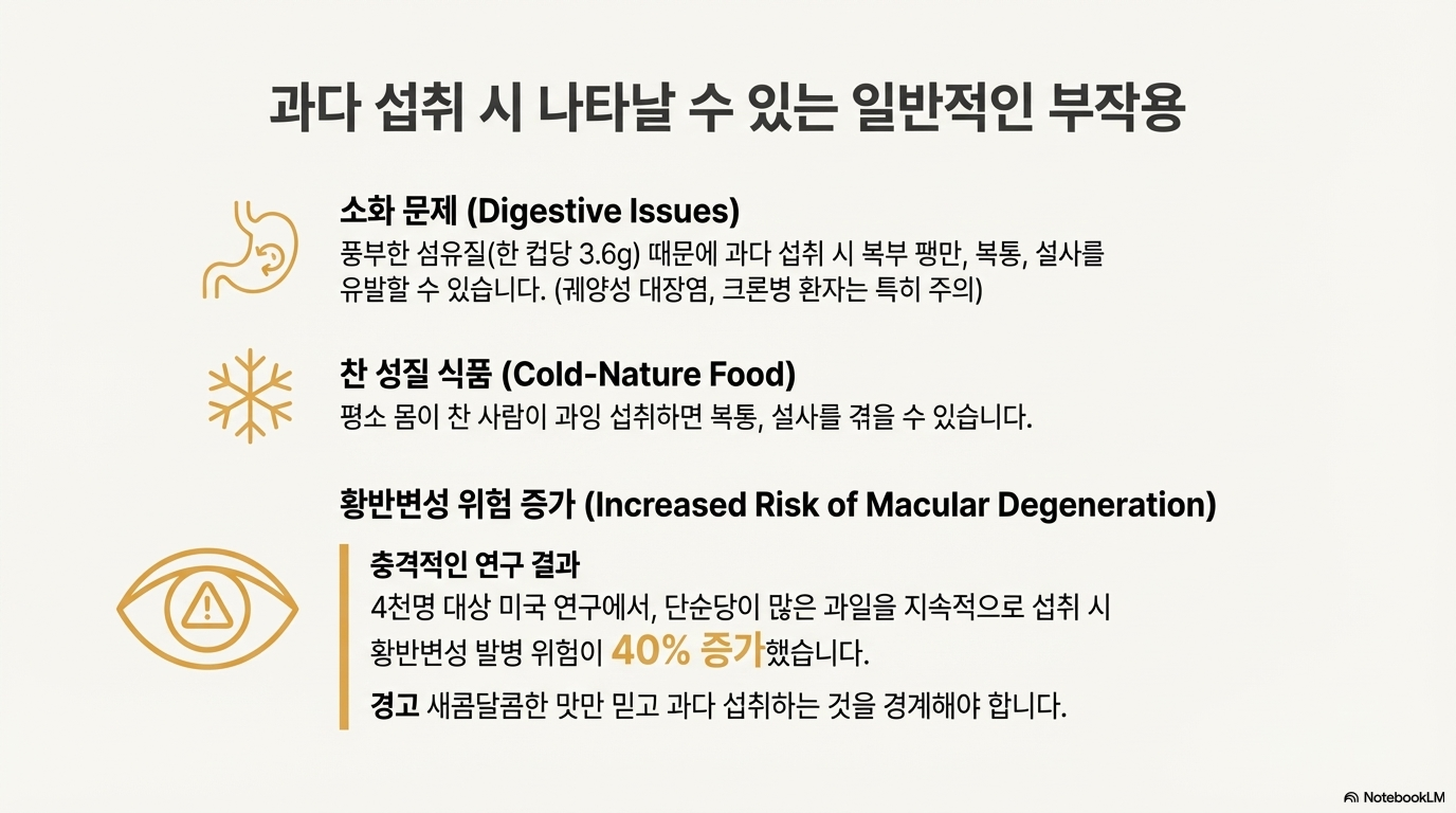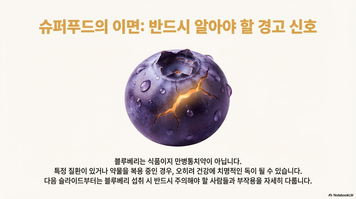 👉과학적 관점: 항산화, 눈 건강, 심혈관 질환 예방, 뇌 건강 효과는 다수의 연구로 입증되었다. 하지만 과다섭취 시 부작용도 명확하다. 특히 혈액희석제 복용자는 약물 상호작용 위험이 있고, 단순당 과다섭취 시 황반변성 발병 위험이 40% 증가한다는 연구 결과가 있다. 안토시아닌은 24시간 이내에 소실되므로 지속적 섭취가 필요하다.