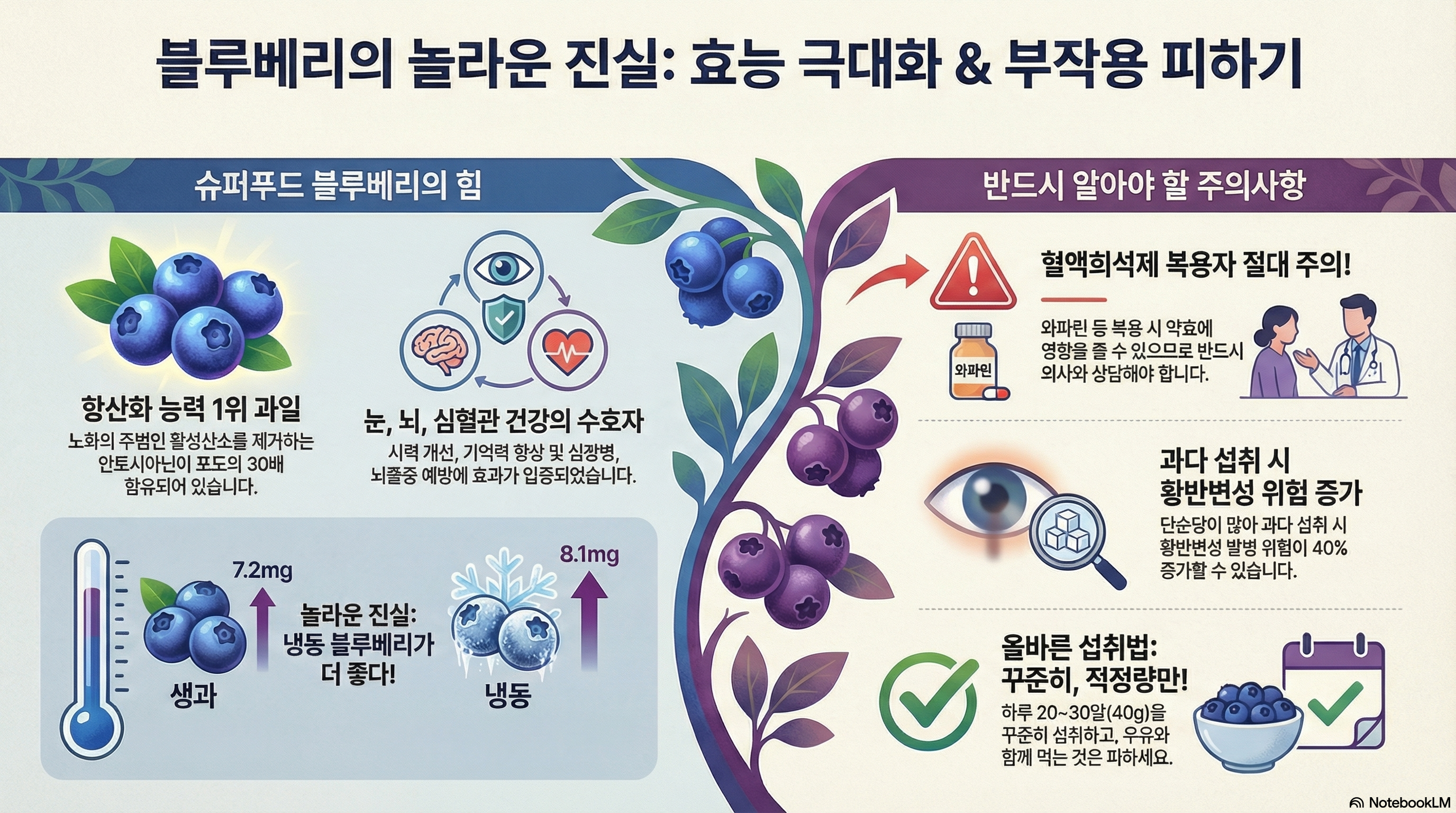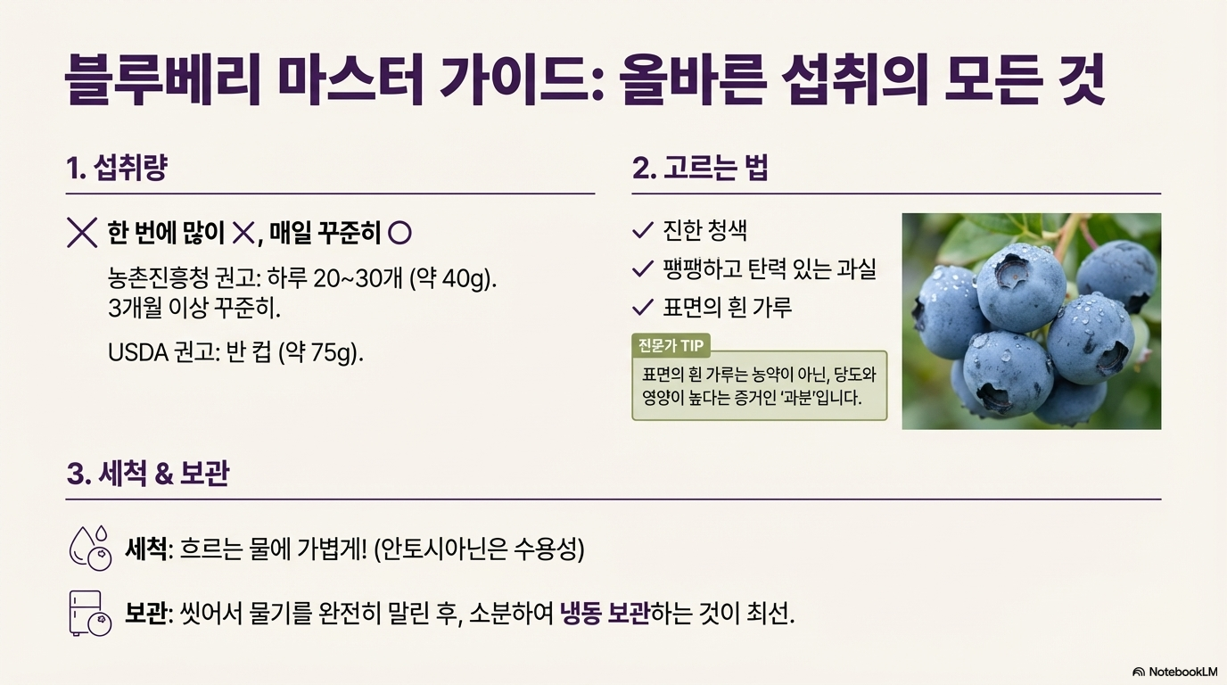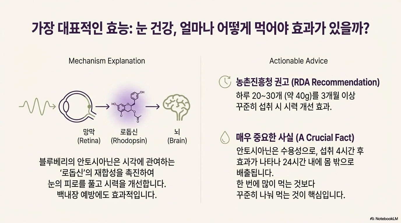 👉과학적 관점: 항산화, 눈 건강, 심혈관 질환 예방, 뇌 건강 효과는 다수의 연구로 입증되었다. 하지만 과다섭취 시 부작용도 명확하다. 특히 혈액희석제 복용자는 약물 상호작용 위험이 있고, 단순당 과다섭취 시 황반변성 발병 위험이 40% 증가한다는 연구 결과가 있다. 안토시아닌은 24시간 이내에 소실되므로 지속적 섭취가 필요하다.