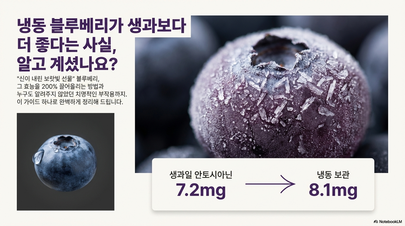 👉특히 놀라운 사실: 냉동 블루베리가 생과보다 안토시아닌이 더 많아요! (생과 7.2mg → 냉동 8.1mg)