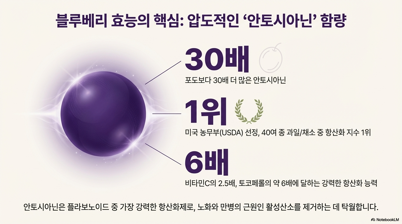 블루베리는 "세계 10대 슈퍼푸드", "브레인 베리"라 불릴 만큼 항산화 효과가 뛰어난 것은 사실이에요. 안토시아닌이 포도의 30배, 40여 종 과일 중 항산화 지수 1위를 차지한 진정한 슈퍼푸드죠.