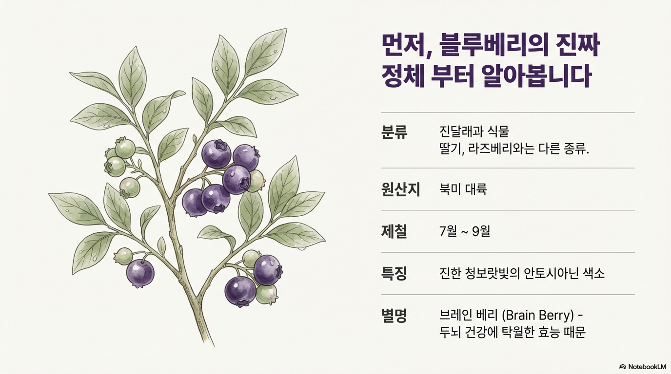 블루베리는 진달래과 식물로 딸기, 라즈베리 등 베리류와는 사실 다른 식물이에요. 북미 원산지의 작은 열매로, 현재는 미국, 캐나다, 동유럽, 아시아에서 널리 재배돼요.
