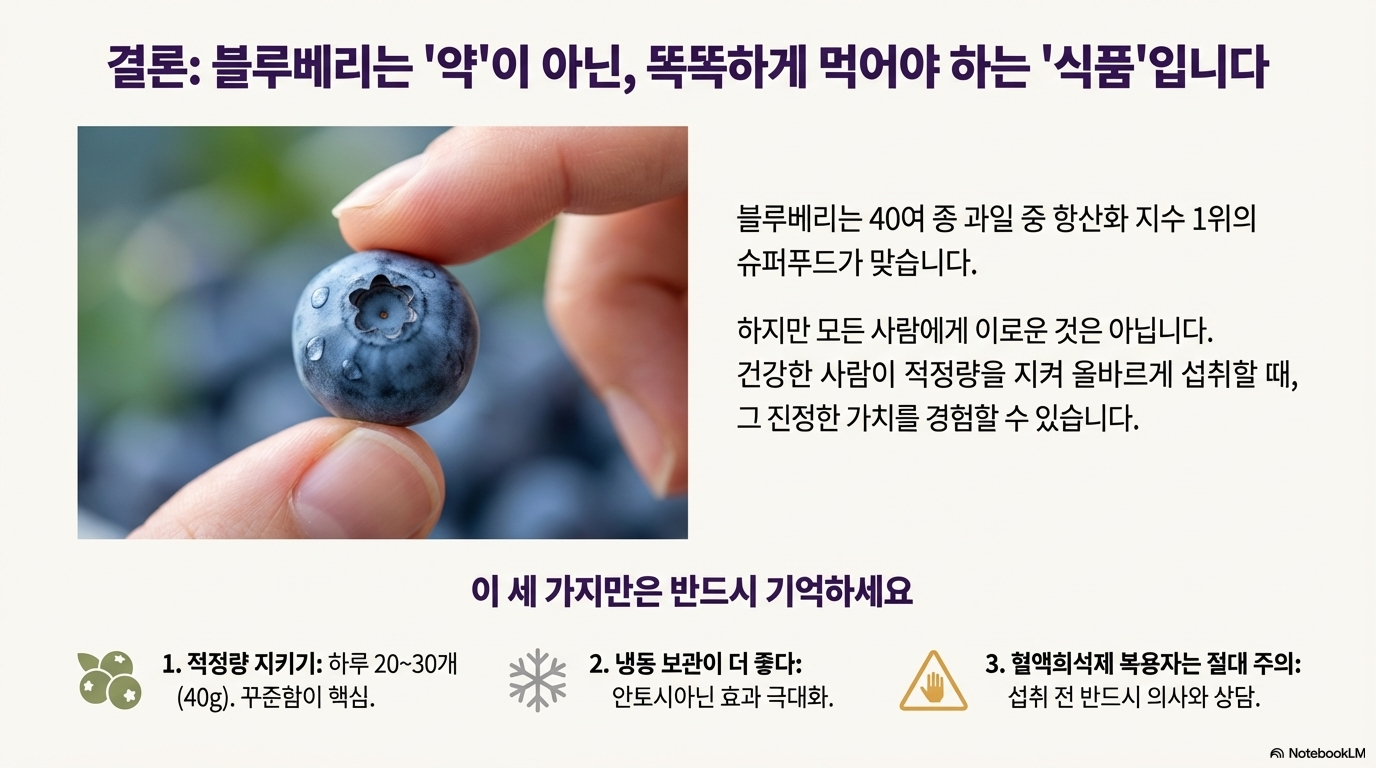 블루베리는 식품이지 약품이 아니에요. 건강한 사람이 적정량을 지켜 올바르게 섭취할 때 항산화, 눈 건강, 심혈관 질환 예방에 도움을 얻을 수 있는 진정한 슈퍼푸드예요. 하지만 약물 복용자, 소화기 질환자는 반드시 주의하세요!