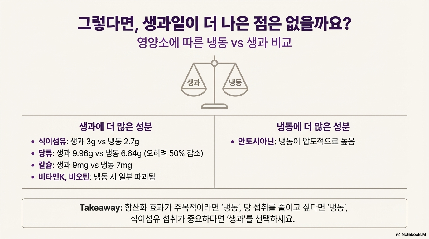 - 당류: 생과 9.96g vs 냉동 6.64g (50% 감소)