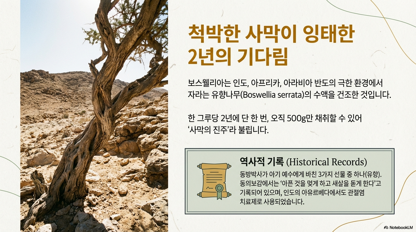 역사적으로 성경에 나오는 동방박사 3인이 아기 예수 탄생 시 선물한 세 가지(황금, 몰약, 유향) 중 하나가 바로 보스웰리아예요. 동의보감에서는 "아픈 것을 멎게 하고, 새살을 돋게 하여 헌 데를 낫게 한다"고 기록되어 있으며, 인도의 전통 의학서 아유르베다에도 관절염 치료 약재로 소개되어 있습니다.