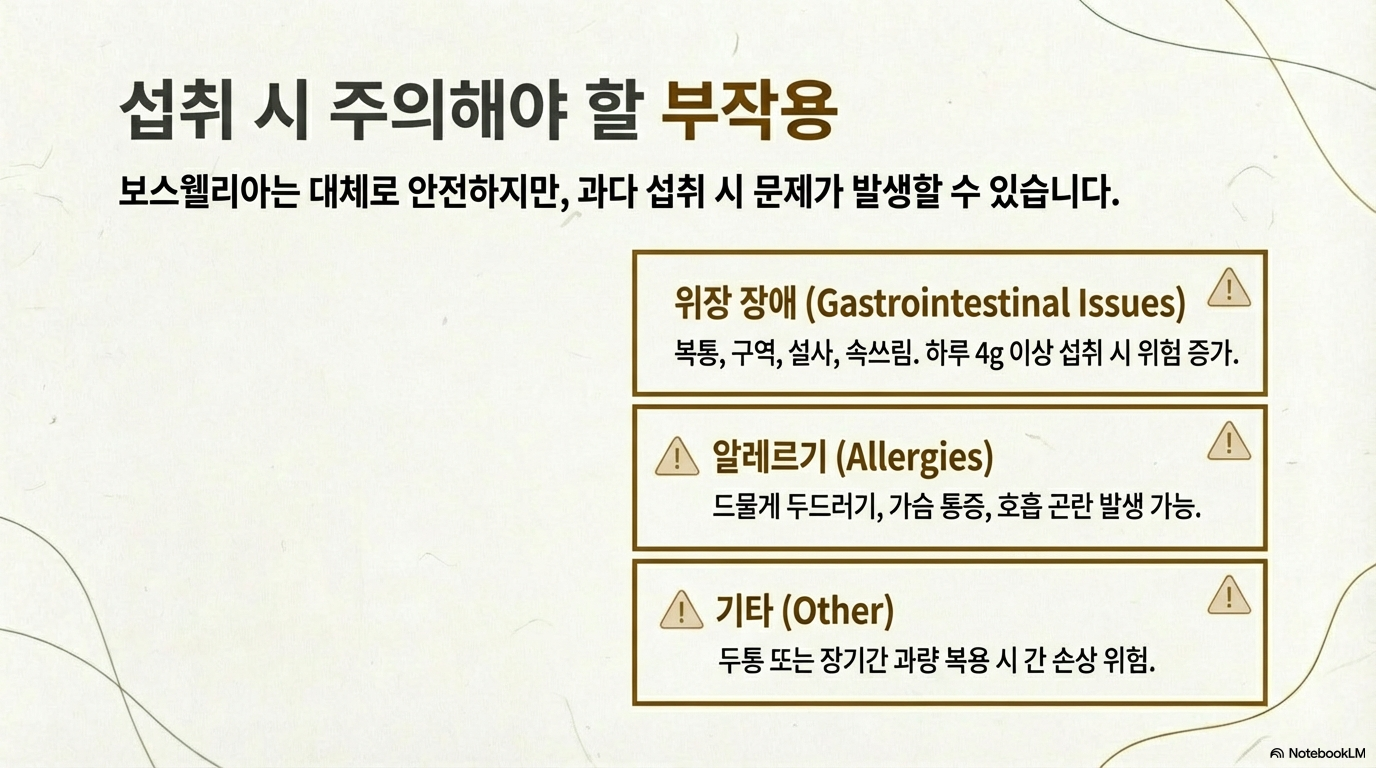 보스웰리아는 비교적 안전한 성분이지만, 일부 사람들에게는 부작용이 나타날 수 있어요.