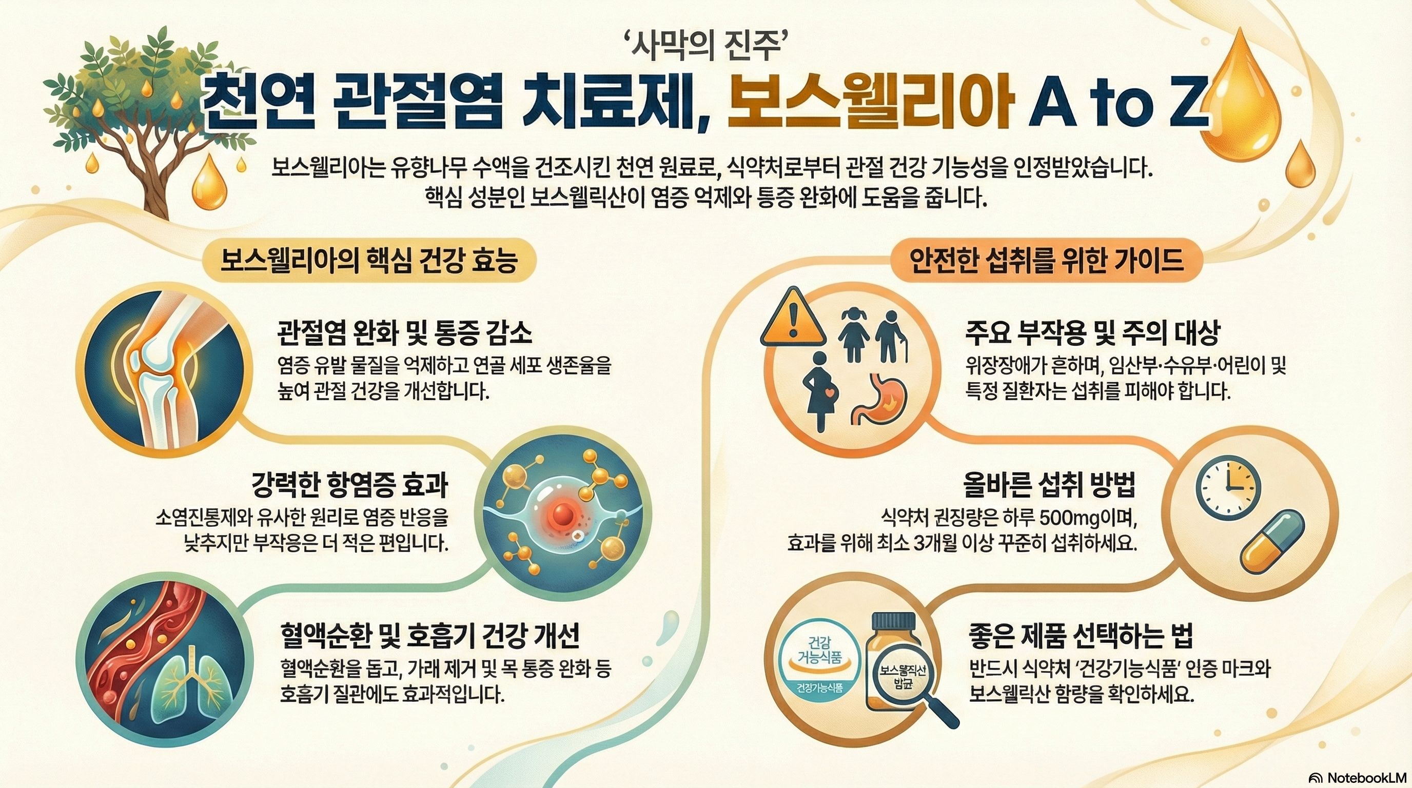 - 보스웰릭산(Boswellic acid): 염증 완화 및 진통 효과