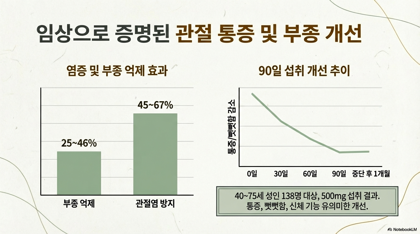 임상 연구 결과, 40~75세 성인 138명을 대상으로 보스웰리아 500mg을 90일간 섭취한 결과 통증, 뻣뻣함, 기능 항목이 모두 유의미하게 개선되었습니다.