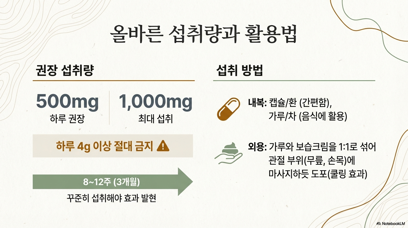 - 하루 500mg: 식약처 인정 일일 섭취량