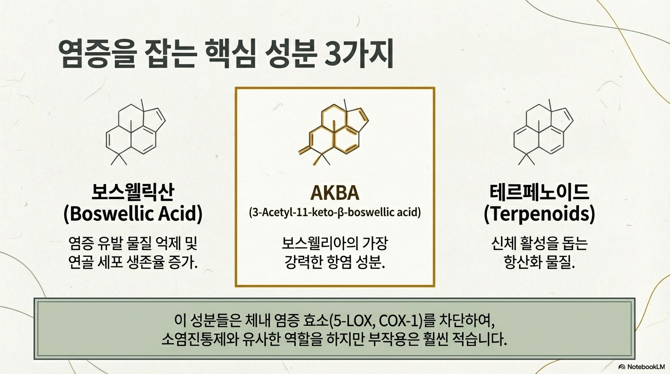 - AKBA (3-Acetyl-11-keto-β-boswellic acid): 가장 강력한 항염 성분