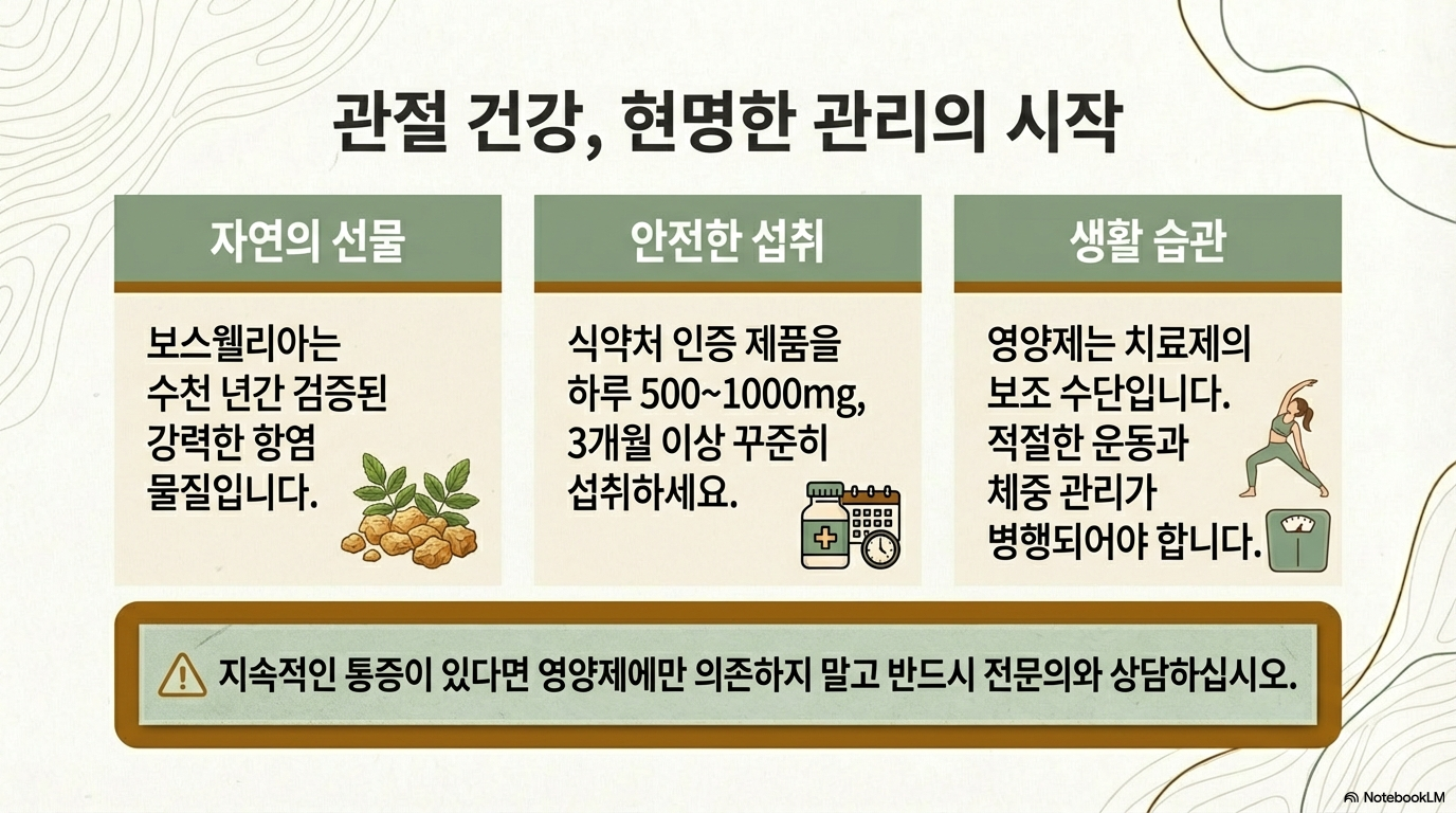 관절 통증의 원인을 정확히 진단받고, 자신의 상태에 맞는 영양제를 선택하는 것이 중요해요. 보스웰리아만으로는 한계가 있을 수 있으니, 적절한 체중 유지, 규칙적인 운동, 균형 잡힌 식단과 함께 병행하시길 권장합니다.