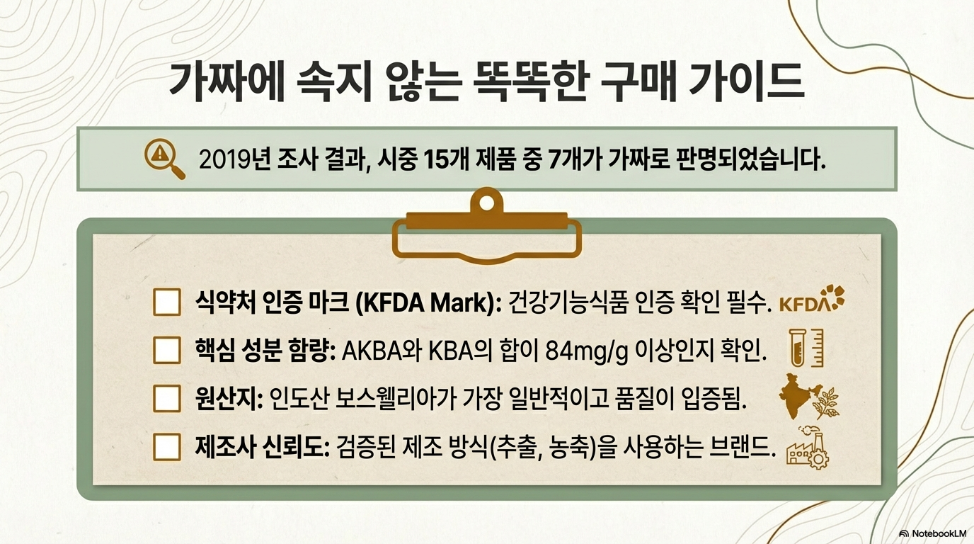 보스웰리아는 식품의약품안전처에서 "관절 건강에 도움을 줄 수 있음"으로 인정한 건강기능식품이에요. 수천 년간 전통 의학에서 사용되어 온 만큼 안전성은 어느 정도 검증되었지만, 아직 대규모 임상 연구가 부족한 것도 사실입니다.