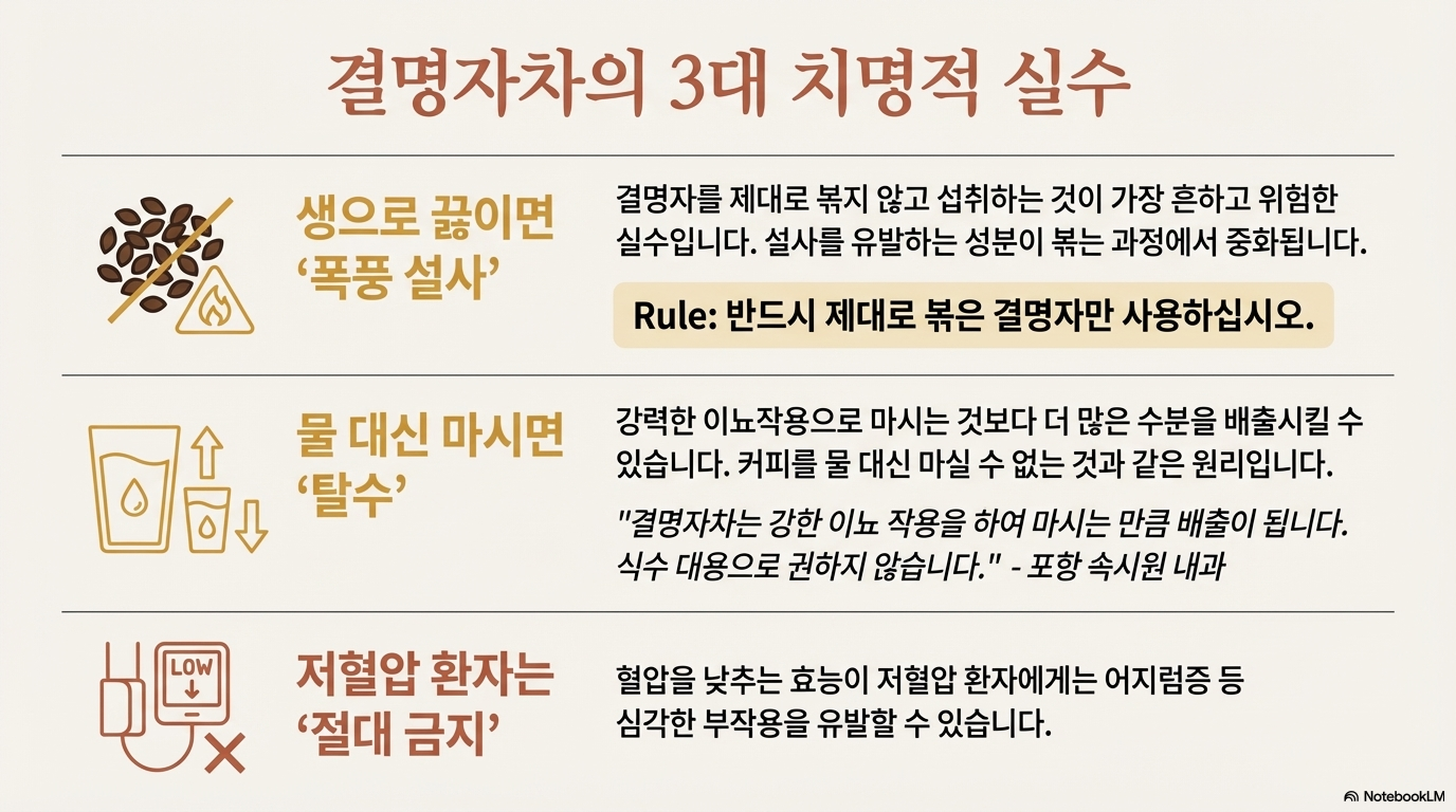 결명자를 생으로 복용할 경우 설사를 일으켜요. 생으로 차를 끓이거나 제대로 볶지 않고 차를 끓일 경우 "폭풍 설사"를 경험할 수 있어요. 여러 자료에서 강조하는 것처럼 반드시 제대로 볶은 결명자를 이용하여 차를 끓여야 해요. 이건 정말 중요한 주의사항이에요!