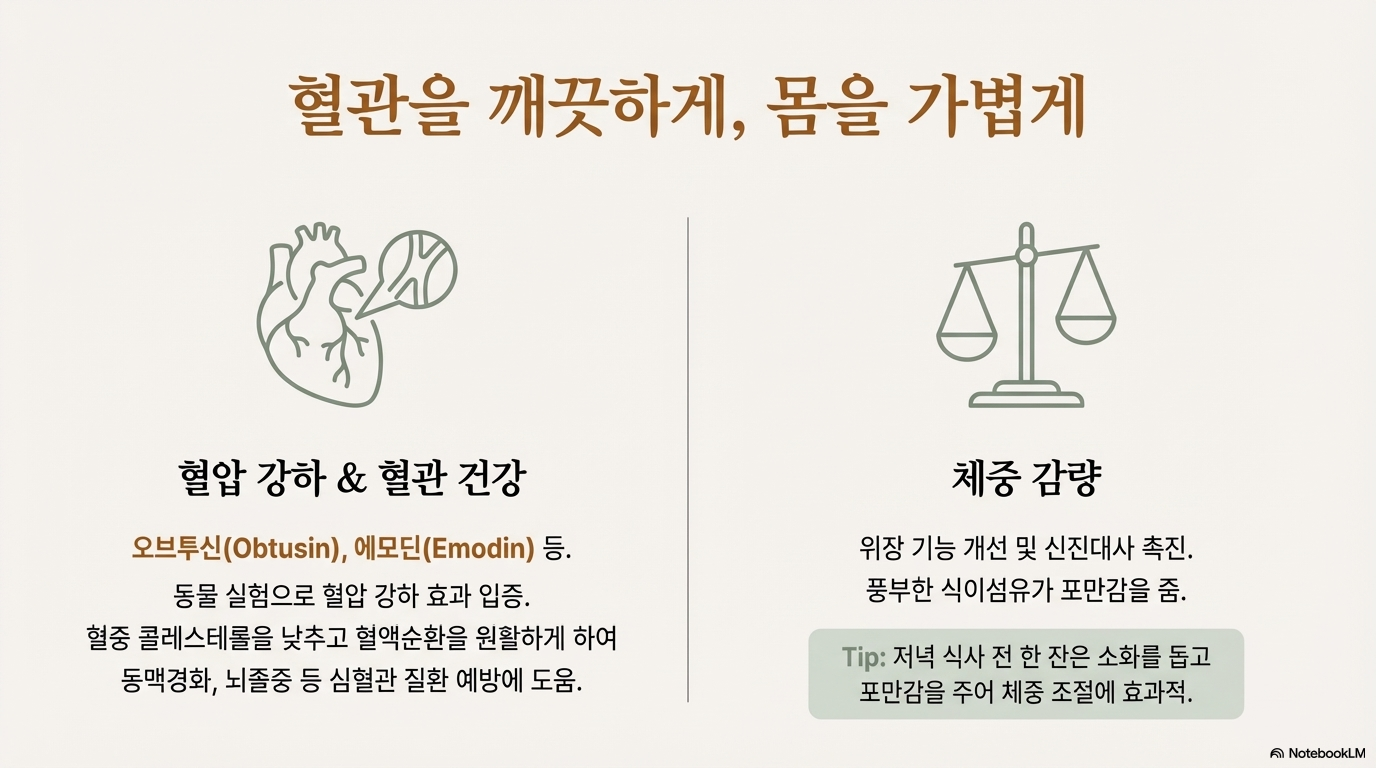 ✅과학적 관점: 눈 건강, 변비 개선, 간 보호, 혈압 강하 효과는 연구로 입증되었어요. 하지만 생으로 끓이면 설사, 강한 이뇨작용으로 탈수 위험, 저혈압 환자 금기라는 명확한 부작용이 있어요.