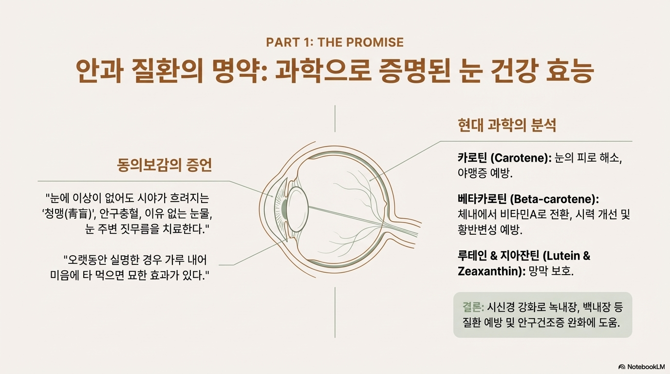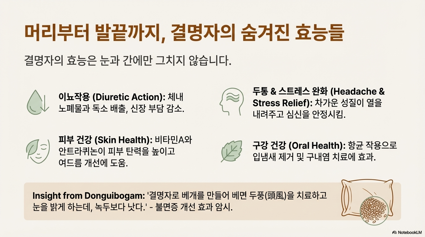 결명자의 이름 자체가 효능을 말해줘요. 동의보감에는 "눈에 이상이 없어도 시야가 흐려지고 점점 안 보이다 결국 물체 분간을 못 하게 되는 병인 청맹(靑盲), 안구충혈, 이유 없는 눈물, 눈 주변 짓무름을 치료한다"고 기록되어 있어요.