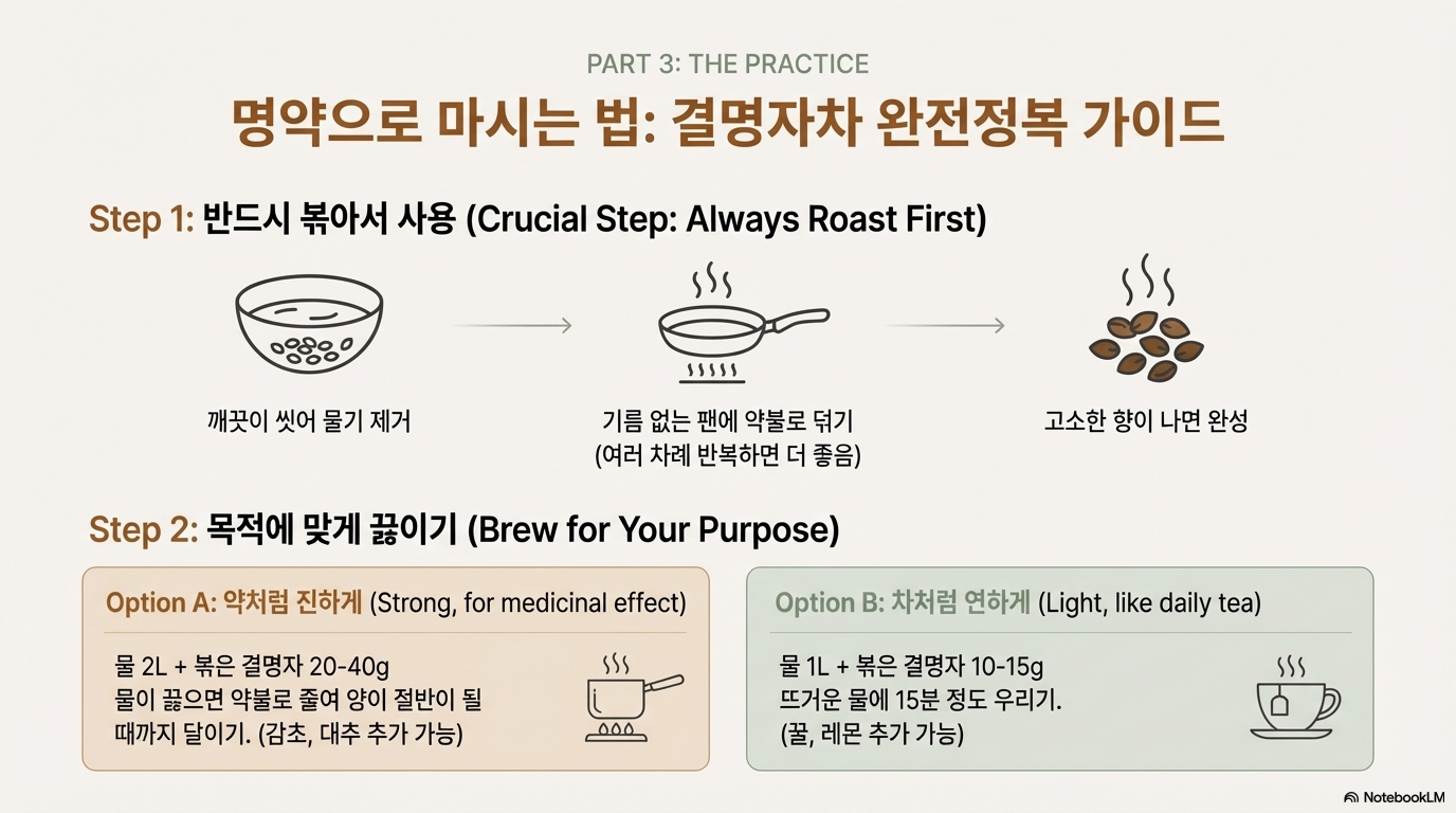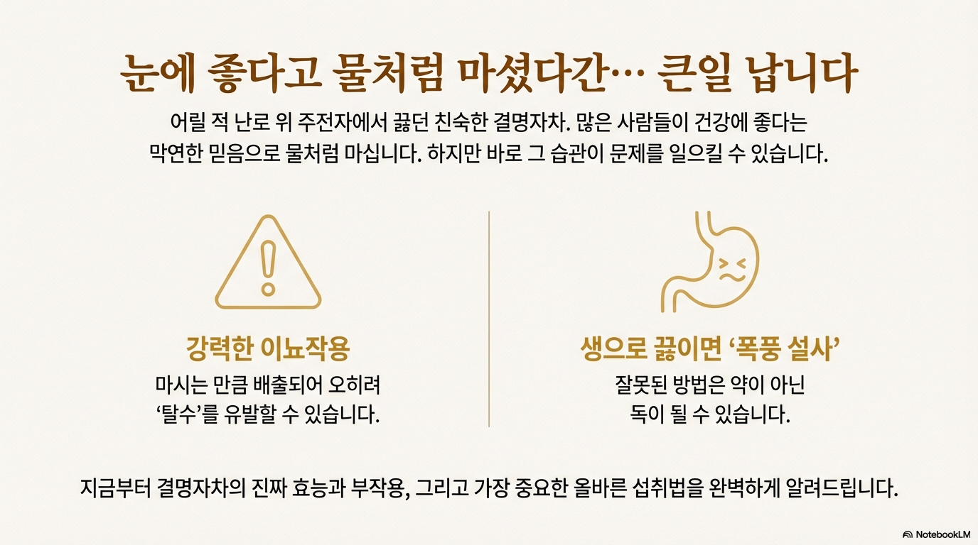 "결명자가 익으면 안과의사가 싫어한다"는 말이 있어요. 이 속담은 결명자의 눈 건강 효능이 얼마나 뛰어난지를 보여주죠. 하지만 눈에 좋다고 물처럼 마시면 큰일나요! 강한 이뇨작용으로 마시는 만큼 배출되어 오히려 탈수를 유발할 수 있거든요. 더 심각한 건 생으로 끓이면 "폭풍 설사"를 경험할 수 있다는 점이에요. 오늘은 결명자차의 진짜 효능과 반드시 알아야 할 부작용, 그리고 올바른 섭취법까지 정확하게 알려드릴게요.