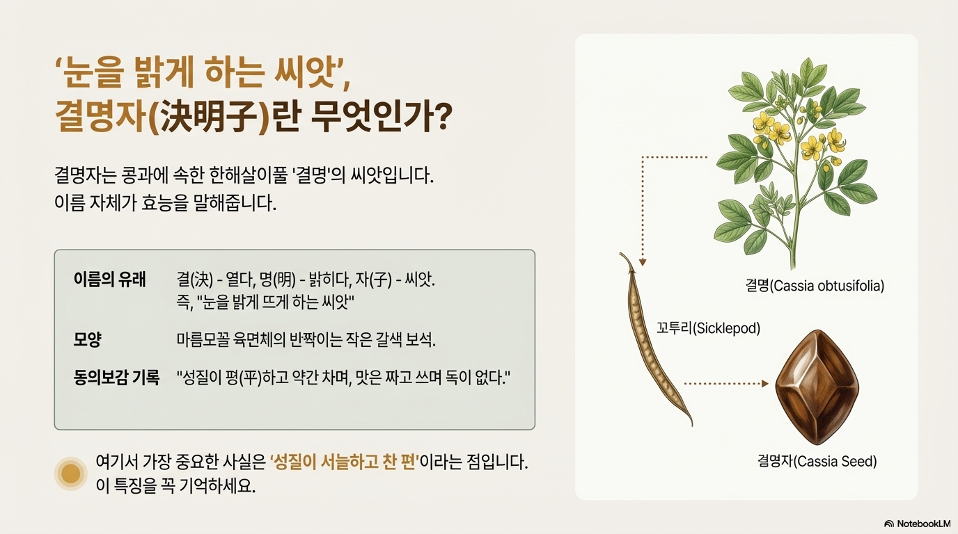 결명자(決明子)는 콩과의 한해살이풀인 '결명'의 씨앗이에요. 이름 자체가 "눈을 밝게 하는 씨앗"이라는 뜻이죠. 가을이 되면 팥 콩깍지처럼 길쭉한 꼬투리 안에서 결명자가 익어가요. 마름모꼴 육면체 모양으로 작은 갈색 보석같이 반짝이는데, 이 반짝이는 모양이 눈을 반짝이게 한다고 해요.