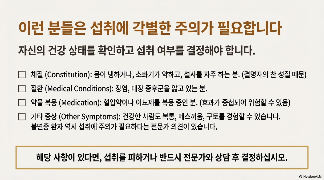✔️ 몸이 차갑거나 소화기능이 약하신가요? → 소량 섭취 또는 주의