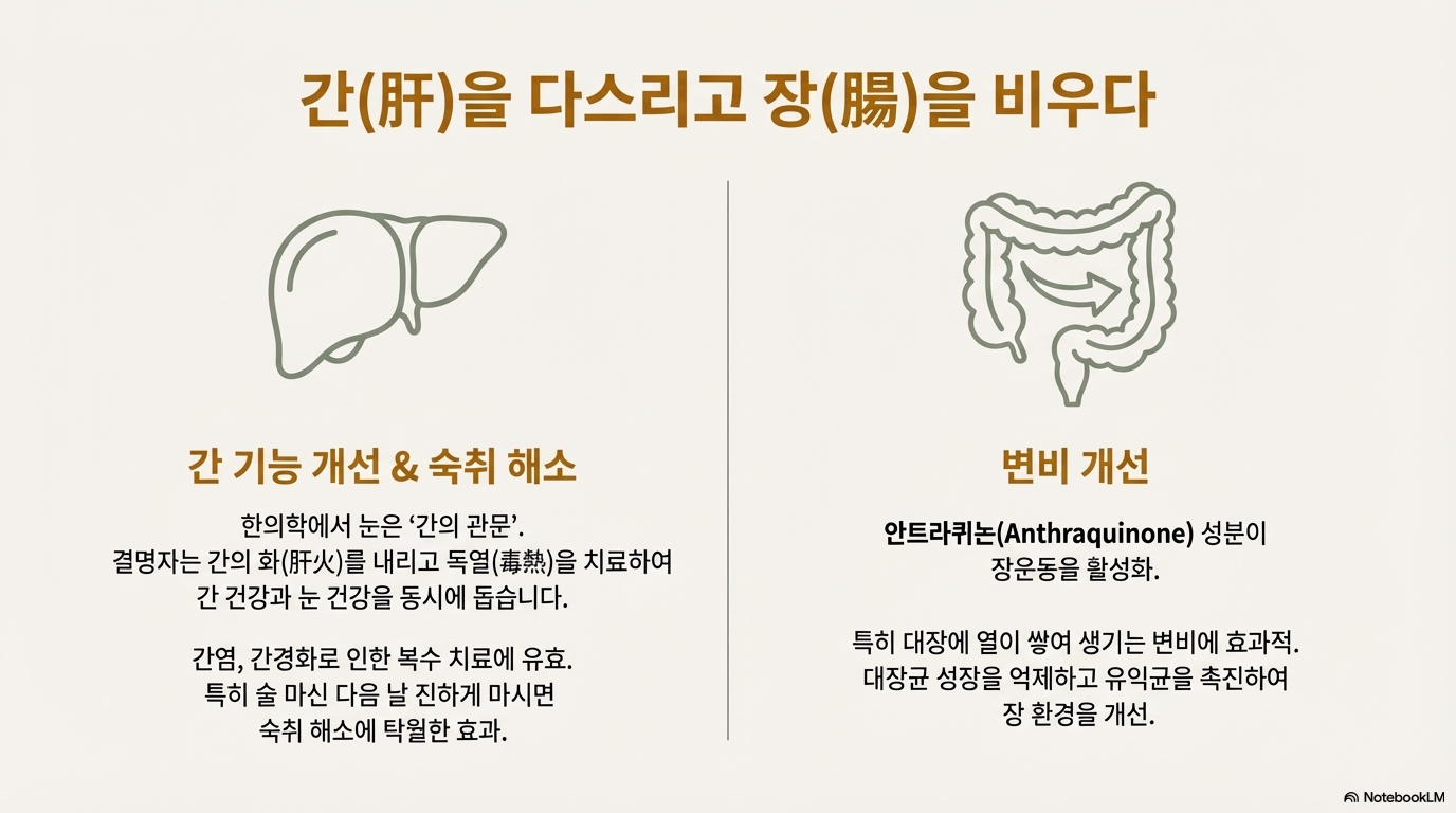 결명자는 성질이 서늘하고 맛은 달고 써서 간염 치료에 유효하고, 간경화로 인한 복수에 쓰이며, 간장의 병변으로 인한 안질에도 효과가 뛰어나요. 간화(肝火)를 내려주고 간기(肝氣)를 도우며, 간의 독열(毒熱)을 치료해요. 눈은 한의학에서 간의 관문으로 보기 때문에 결명자가 간 건강과 안구건강에 모두 도움이 되는 거죠.