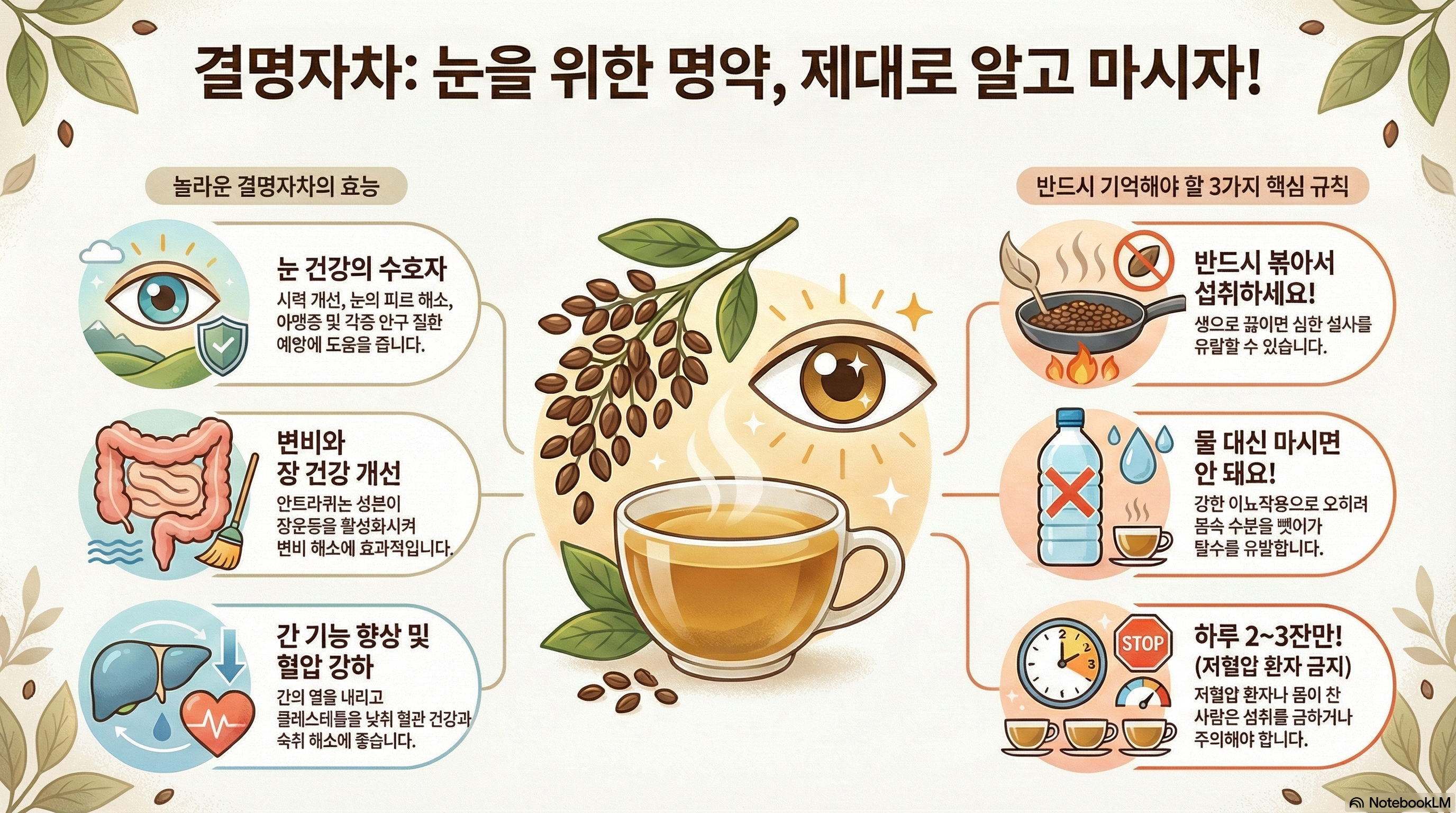 결명자차는 건강한 사람이 적정량을 지켜 올바르게 섭취할 때 눈 건강을 비롯한 다양한 건강 효과를 얻을 수 있는 훌륭한 건강차예요. 하지만 저혈압, 소화기 약자, 설사 체질인 분들은 반드시 주의하세요!