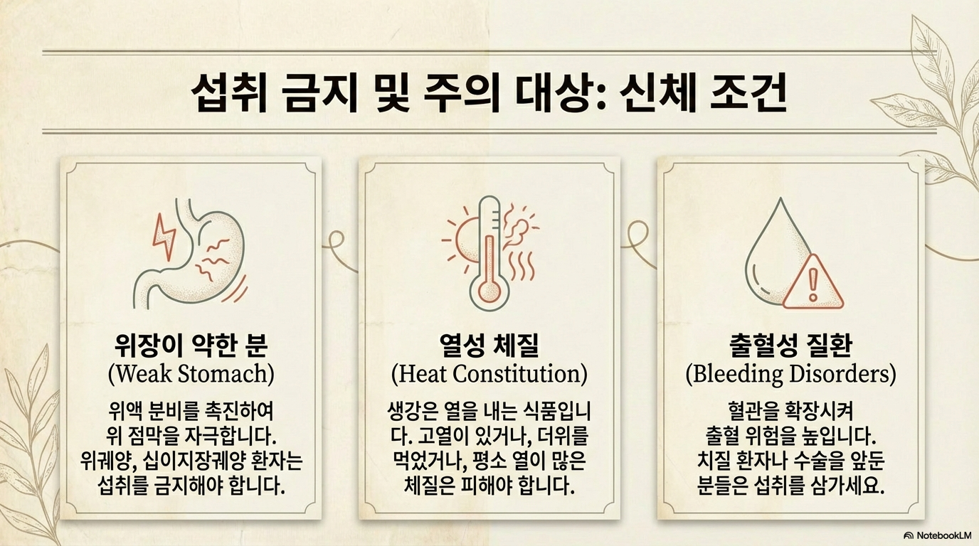 ✅ 위장이 약하거나 열성 체질, 출혈성 질환이 있는 분은 주의가 필요해요