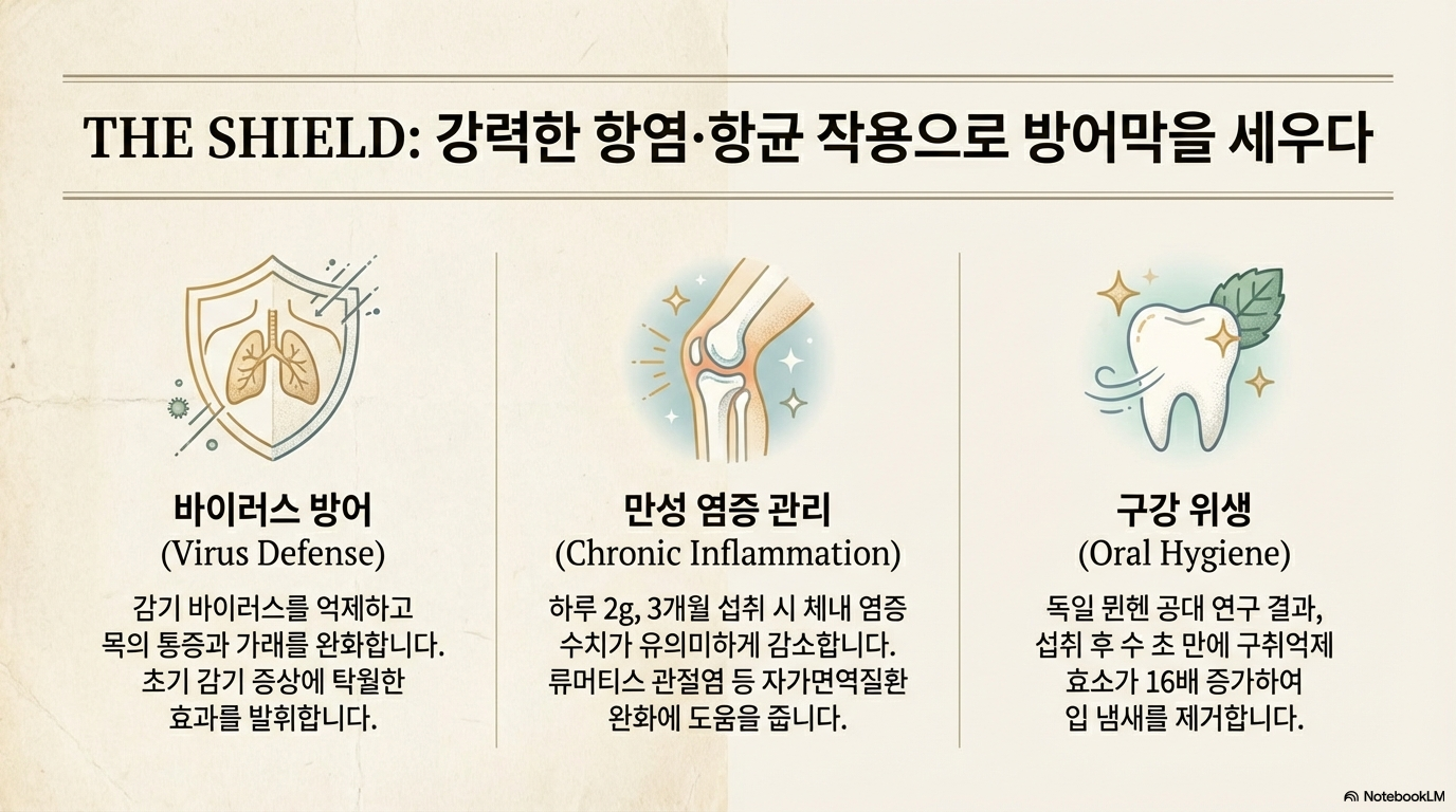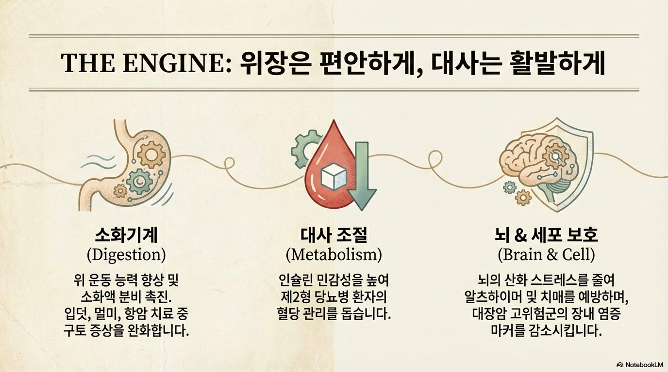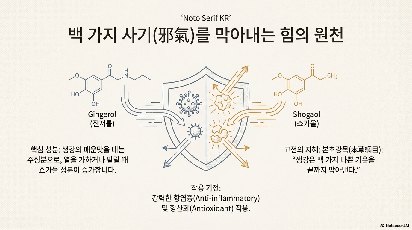 생강의 매운맛을 내는 진저롤과 쇼가올 성분은 강력한 항염증, 항산화 작용을 하며, 각종 질병 예방과 치료에 탁월한 효과가 있어요. 본초강목에서는 생강이라는 이름 자체가 '백 가지 사기(邪氣)를 끝까지 막아낸다'는 의미를 담고 있다고 설명할 정도예요.